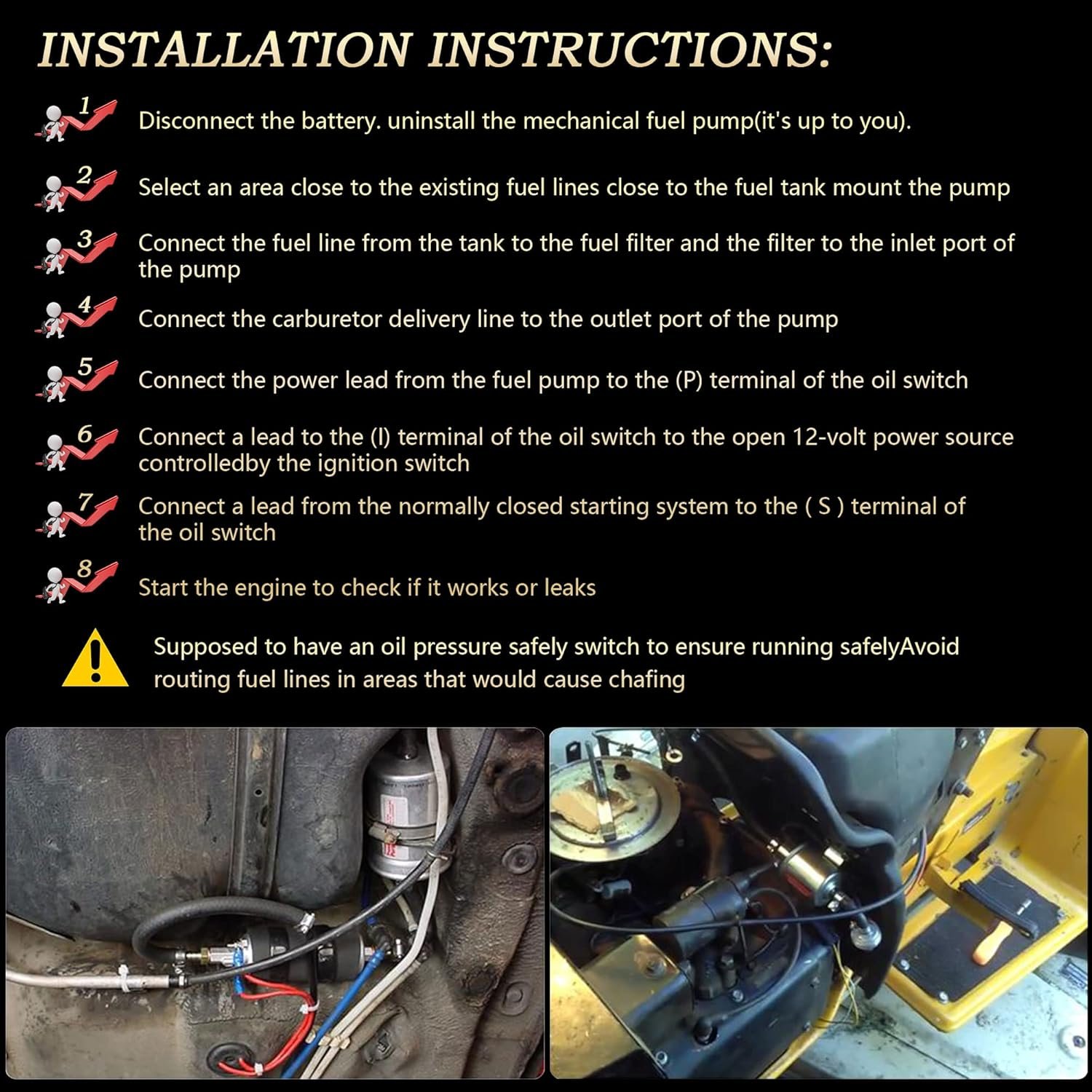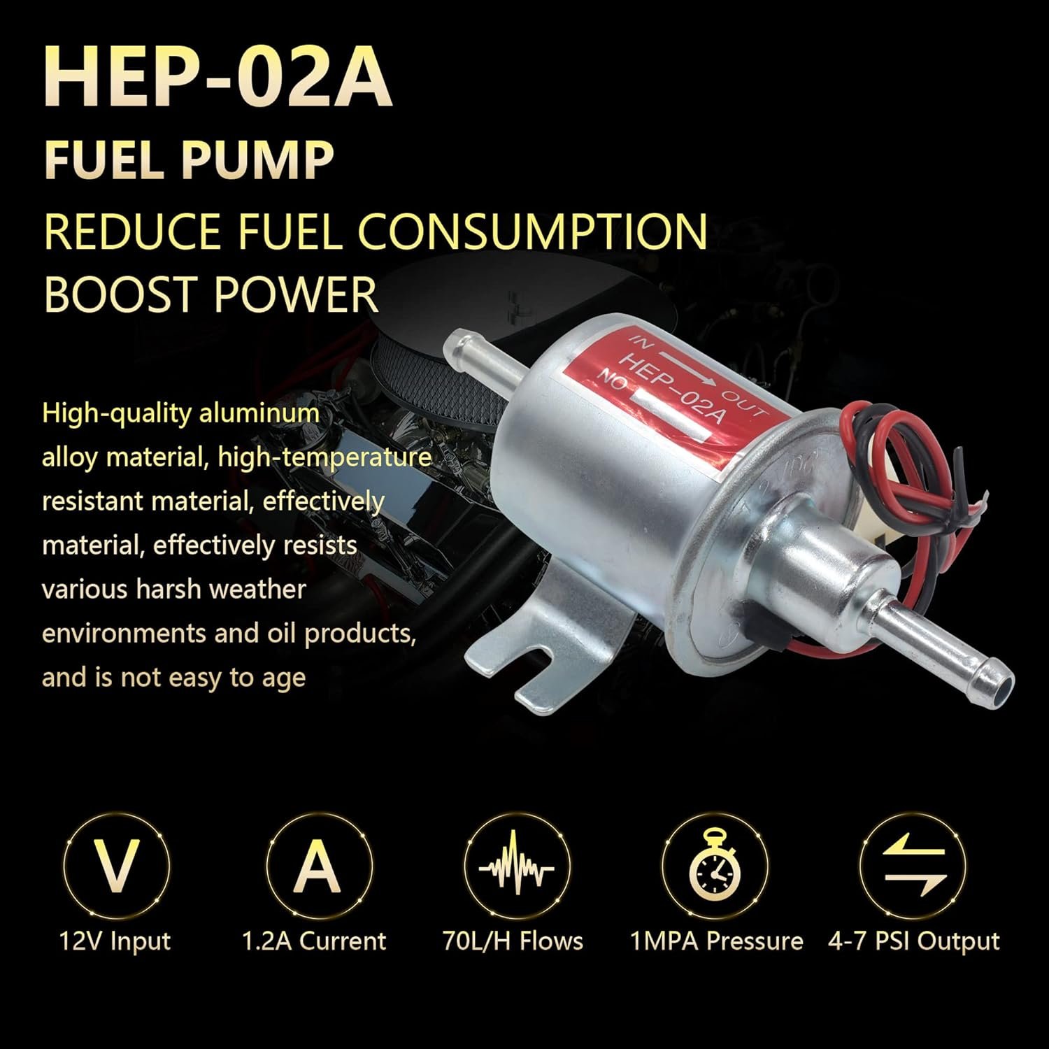 🚗Specification: Inline fuel pump, Output Pressure: 5-9 PSI; Voltage: 12V; Inlet & Outlet size: 5/16”; Current: ≤1.5A