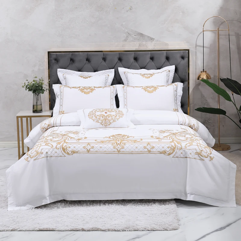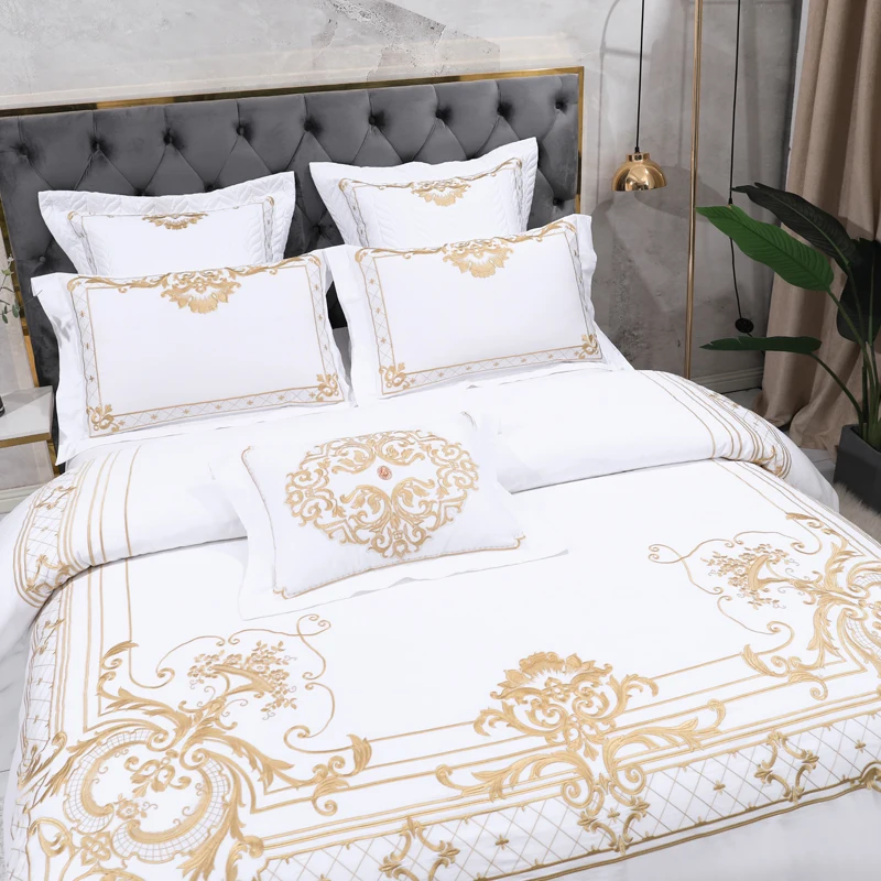 Egyptian Cotton Bedding Set, Duvet Cover, Bed Sheet, Pillowcases, Luxury European Palace Style, Gold Embroidery, 4 Pcs, 7Pcs