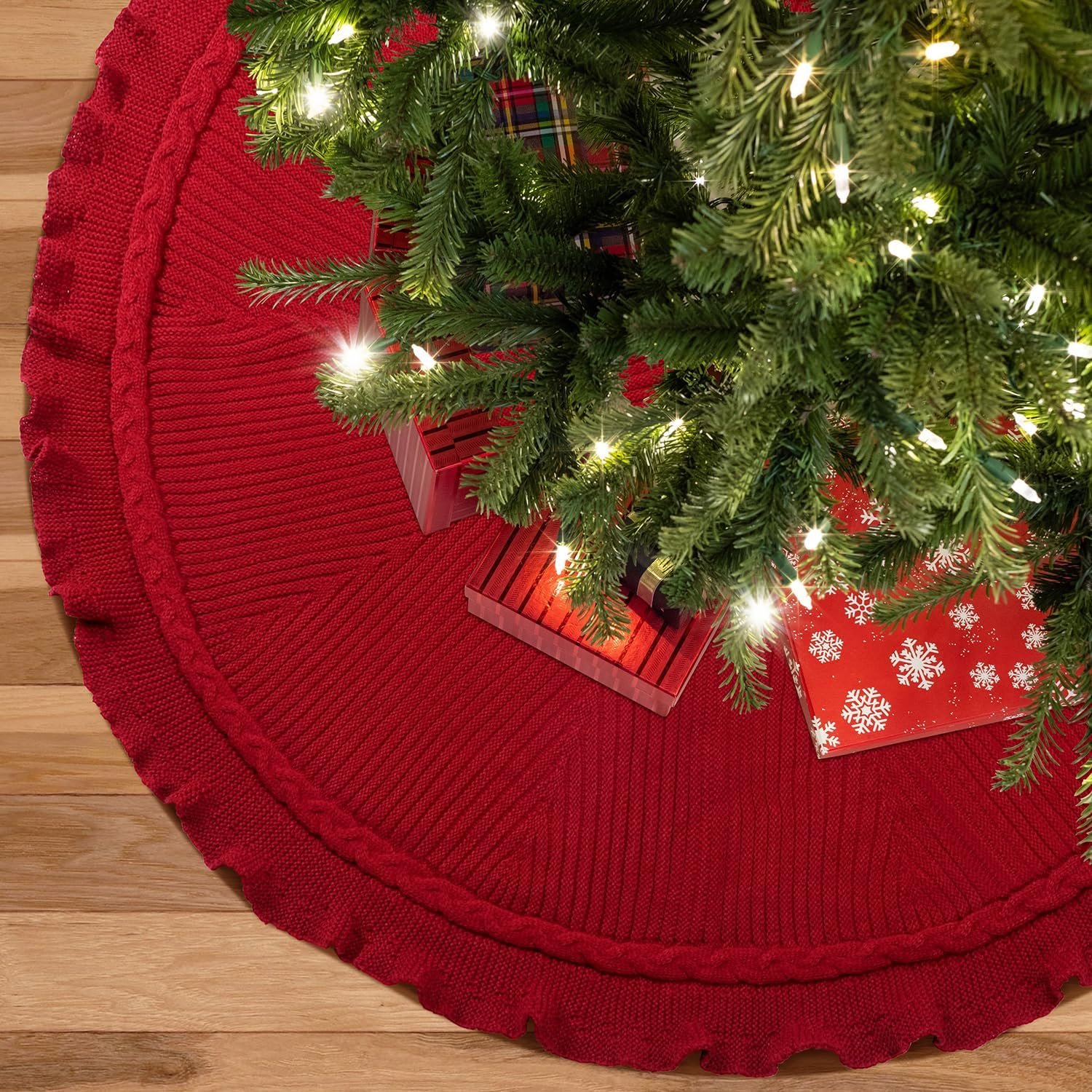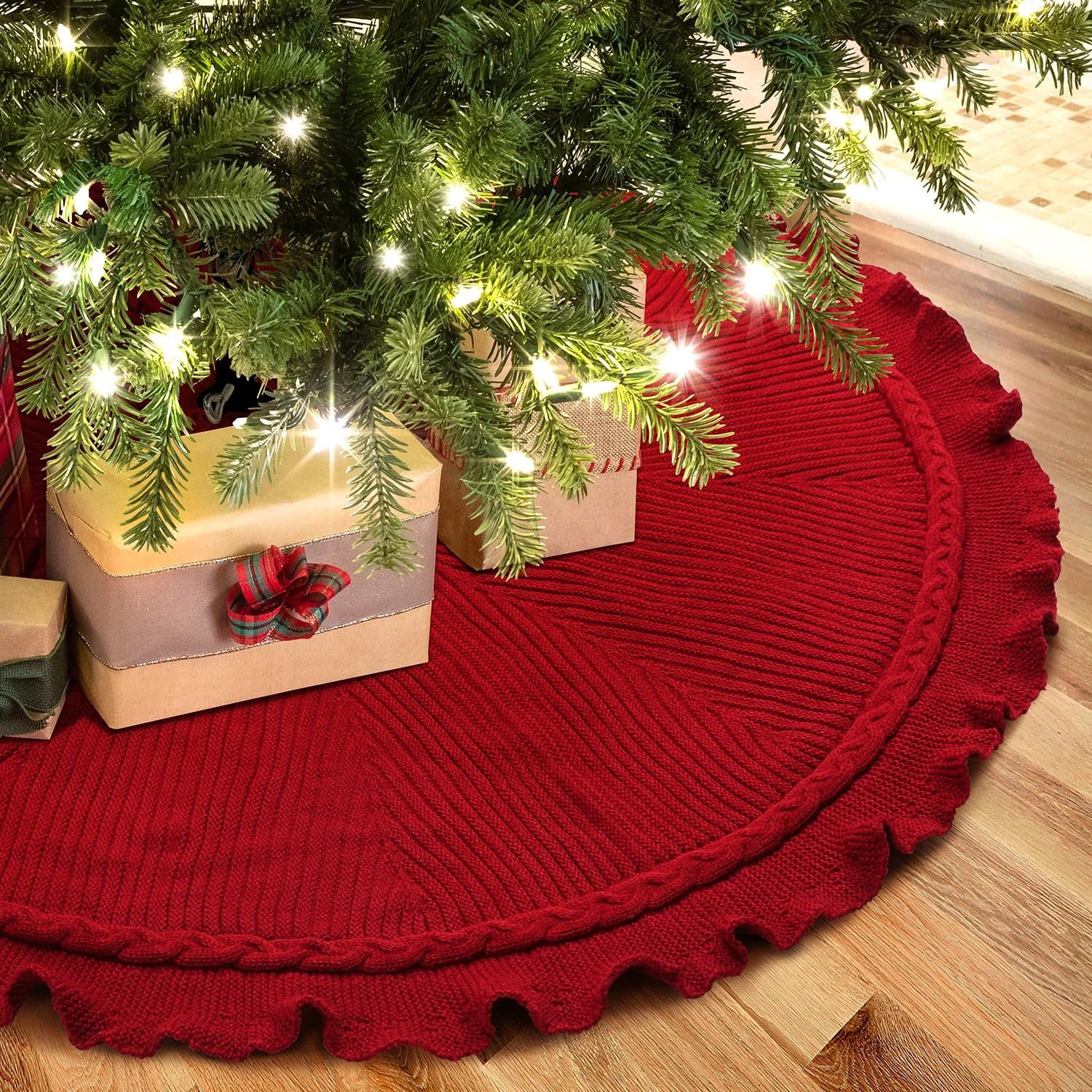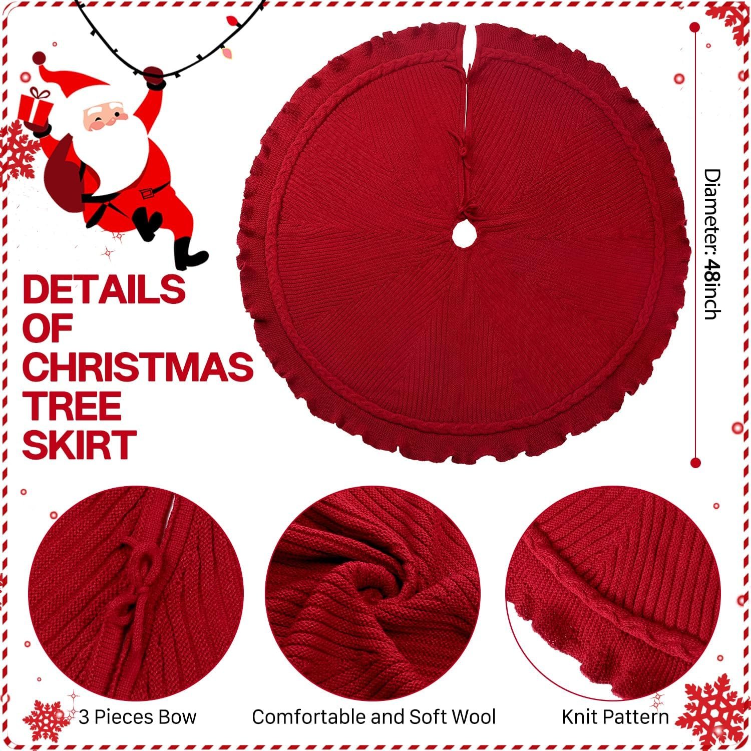 EIMMBD Christmas Tree Skirt, 48 inches Cable Knit Knitted Thick Rustic Christmas Tree Decoration for Xmas Indoor Home Holiday(A-Red)