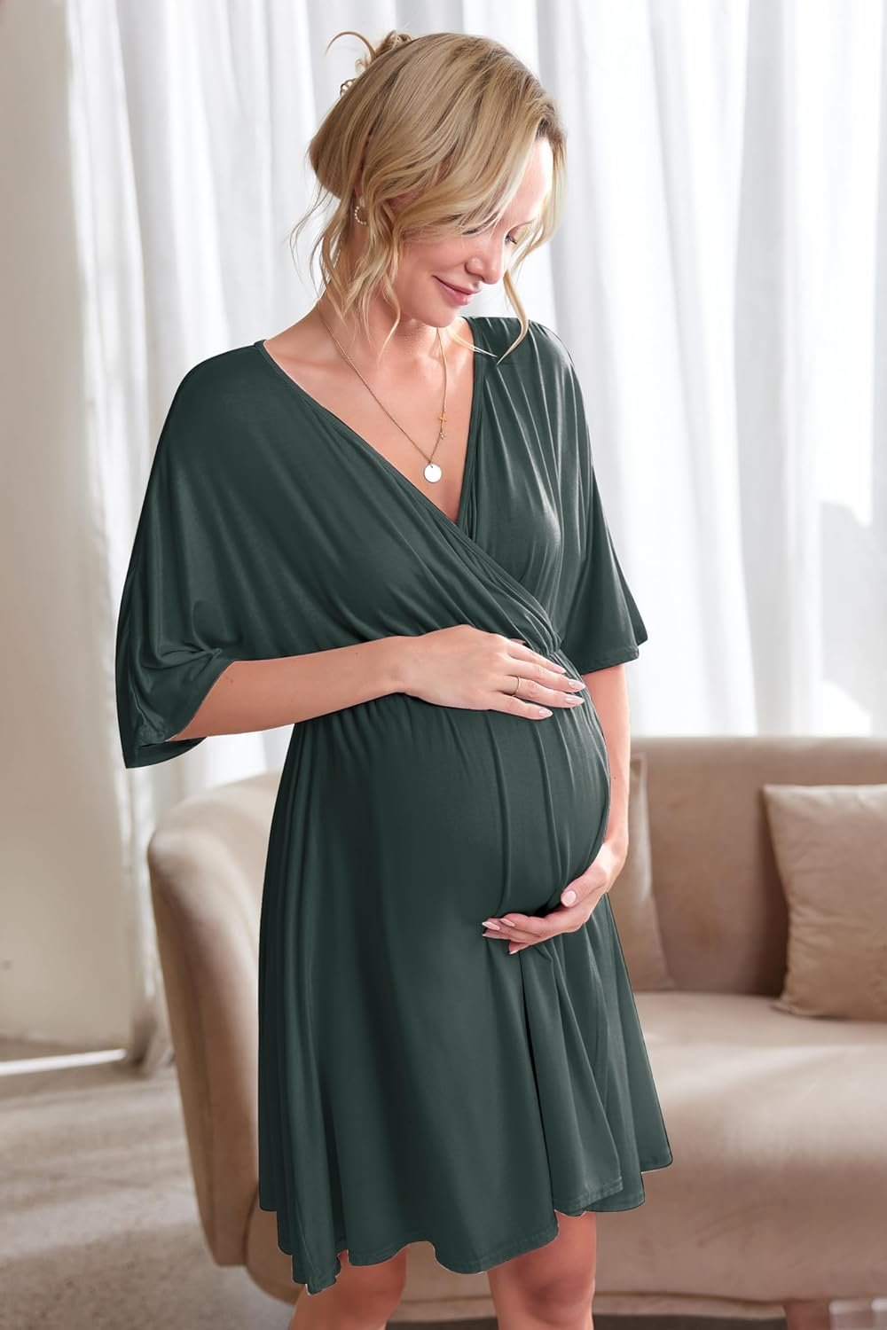 Customers find the maternity gown comfortable with its thick, soft fabric and appreciate its versatility, with one noting it can pass as a casual dress. The gown is praised for its functionality, particularly for nursing and hospital use, and its stretchy material provides enough room for skin-to-skin contact. Customers disagree on the fit, with some finding it too short. The material quality also receives mixed feedback, with some praising the thick material while others find it feels cheap.