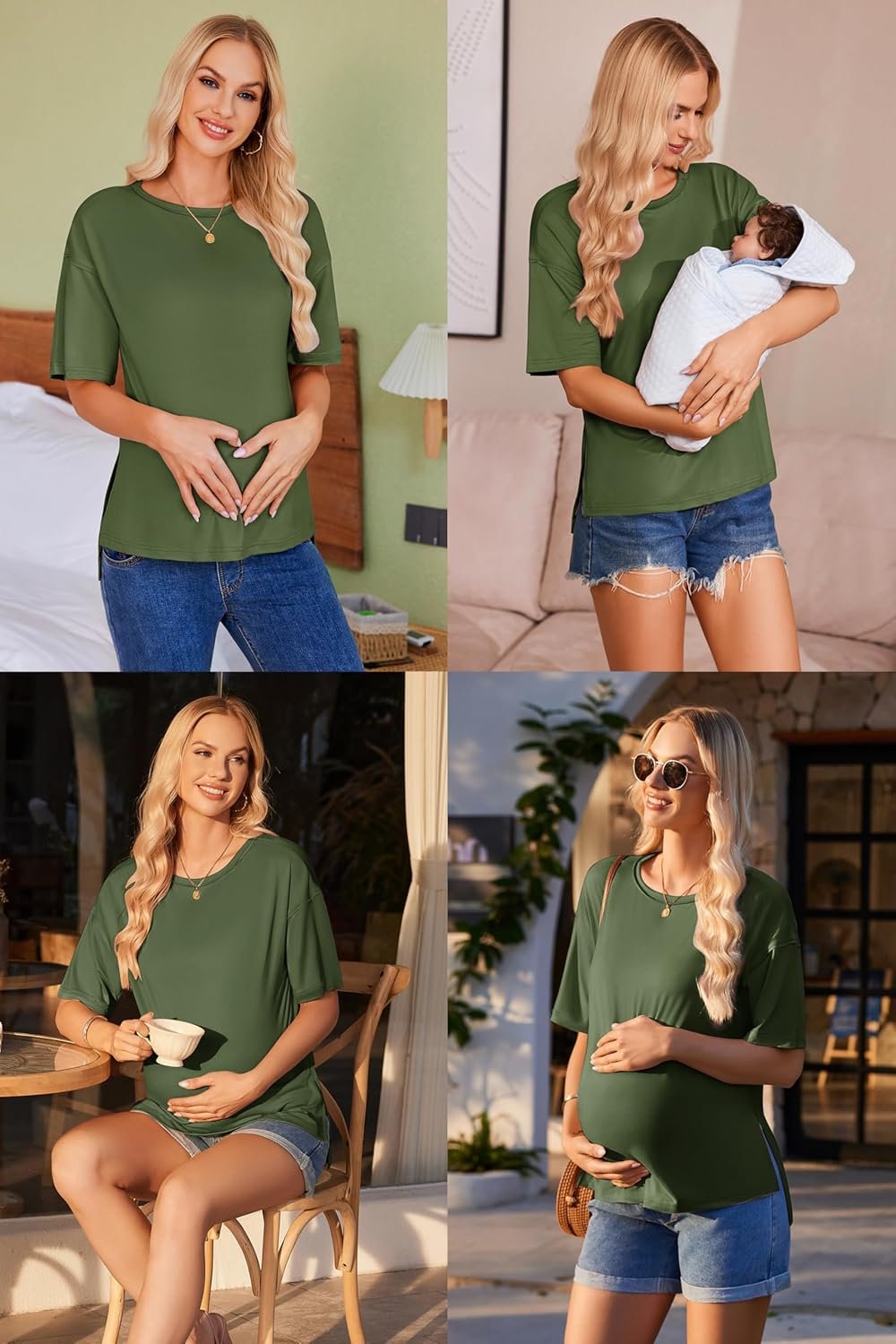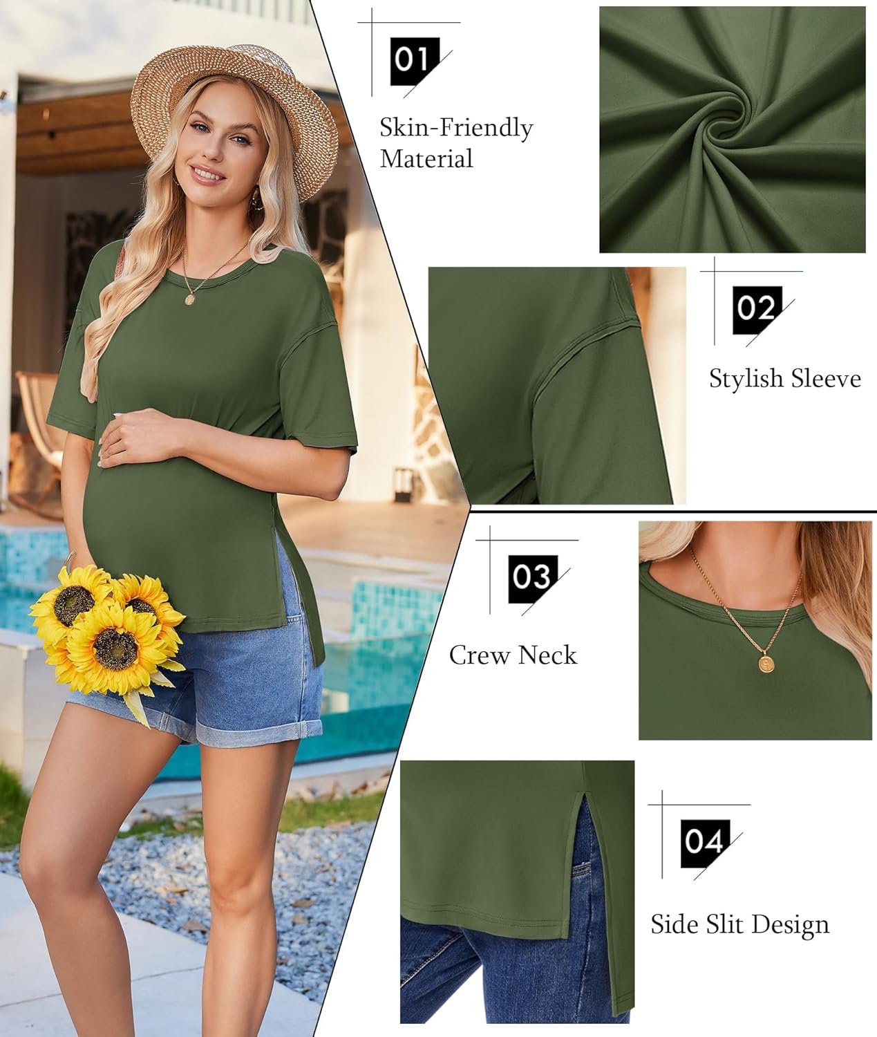 Ekouaer Maternity Shirts 3 Packs Short Sleeve Womens Oversized Pregnancy Tops Split Side Postpartum Blouse Clothes S-XXL