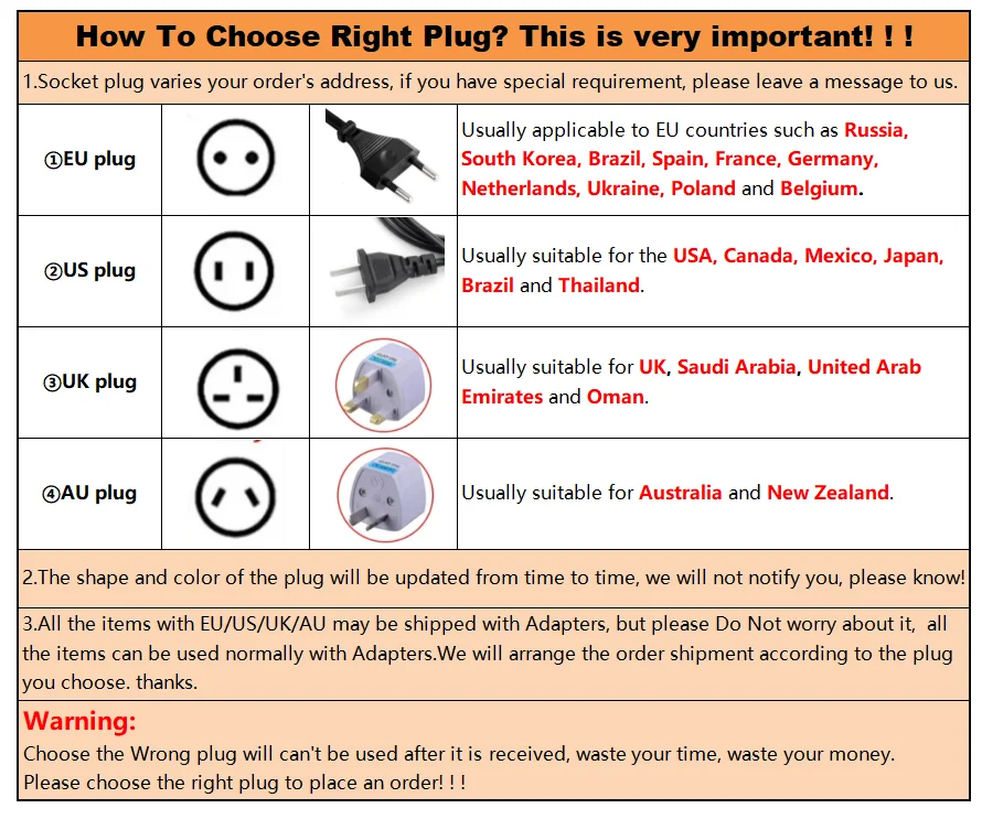 3.All the items with EU/US/UK/AU may be shipped with Adapters, but please Do Not worry about it, all the items can be used normally with Adapters.We will arrange the order shipment according to the plug you choose. thanks.