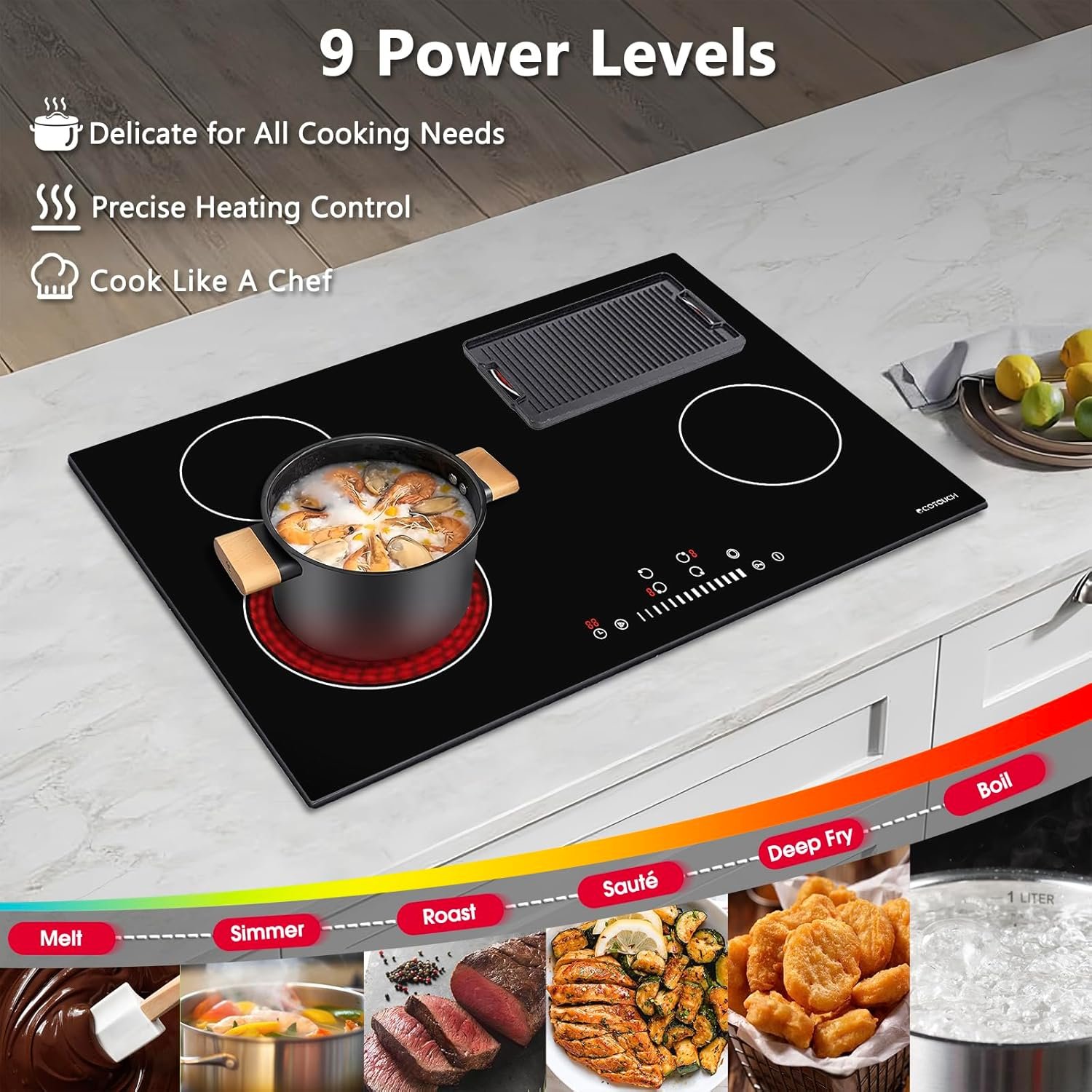 Easy Control 30 Inch Electric Cooktop: Instead of changing setting step by step, you could achieve precise power level and timer settings by sliding finger over the slidding buttons. 1-99min Timer and Continue/Pause function makes cooking easy and enjoyable, almost heating up instantly due to application of premium heating elements, no more waiting for warming up. Now, set power&timer and then enjoy leisure cooking time