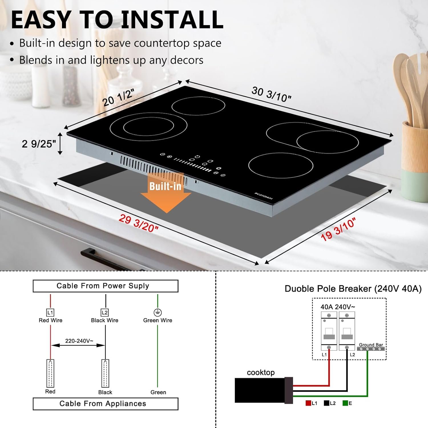 User Friendly 220v Electric Cooktop: Works with all kind cookwares and it comes 4.9ft premium conduited power cord fixed to the 30″ electric cooktop, quite easy DIY installation with basic handy skills. Perfectly well packed and avoids any damage during shipment. Please confirm if the cooktop stove top is suitable before purchasing: works off 220~240V/60Hz(NOT for 120V), product size (WxDxH): 30 3/10″x 20 1/2″ x 2 9/25″, cut out size :(WxD): 29 3/20″ x 19 3/10″