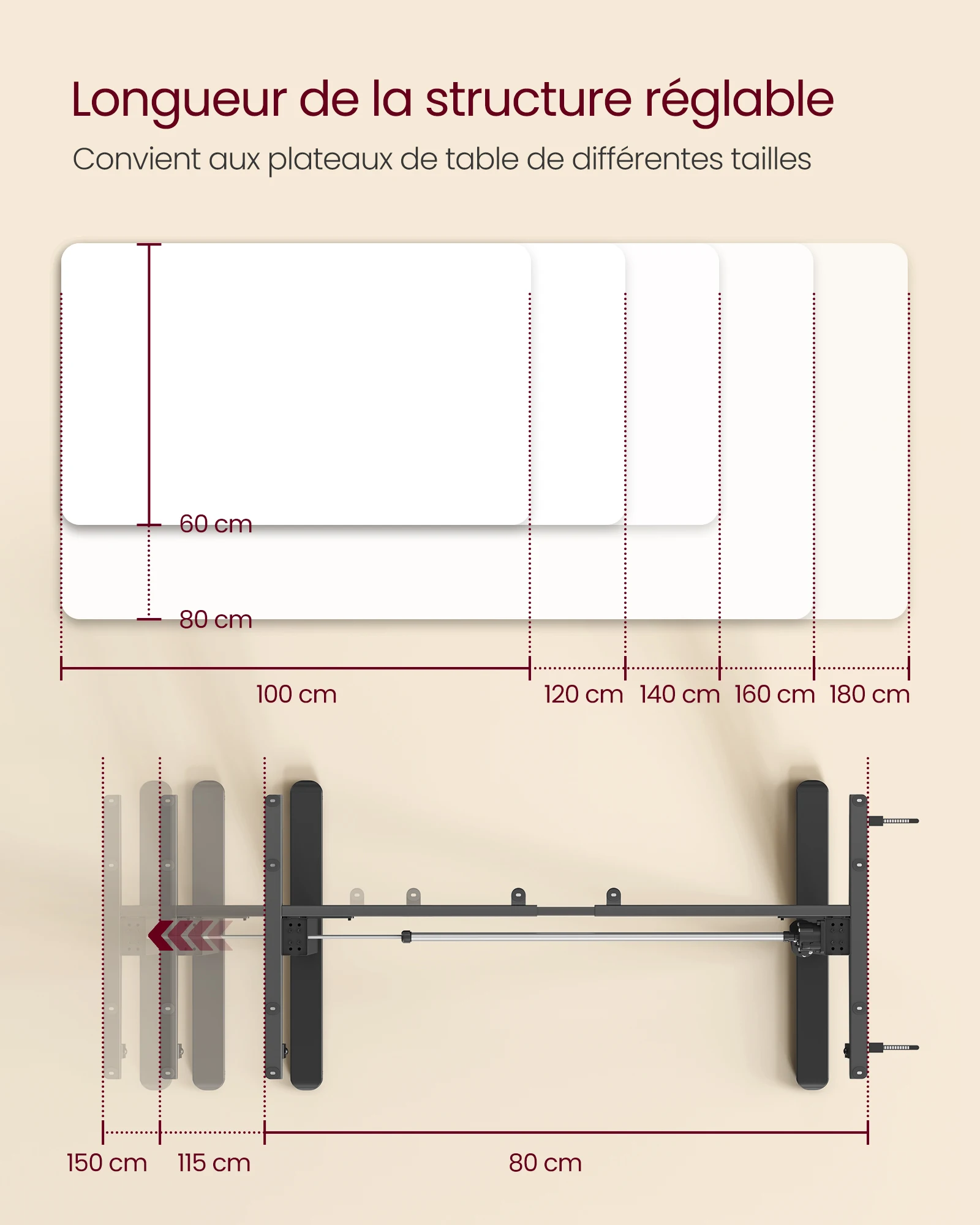ã€CADRE DE BUREAU AJUSTABLE】Ce cadre de bureau noir est réglable en longueur de 80 à 150 cm, il convient aux plateaux de table de 100 à 160 cm de longueur et de 50 à 80 cm de largeur. Réglez cette structure selon vos besoins