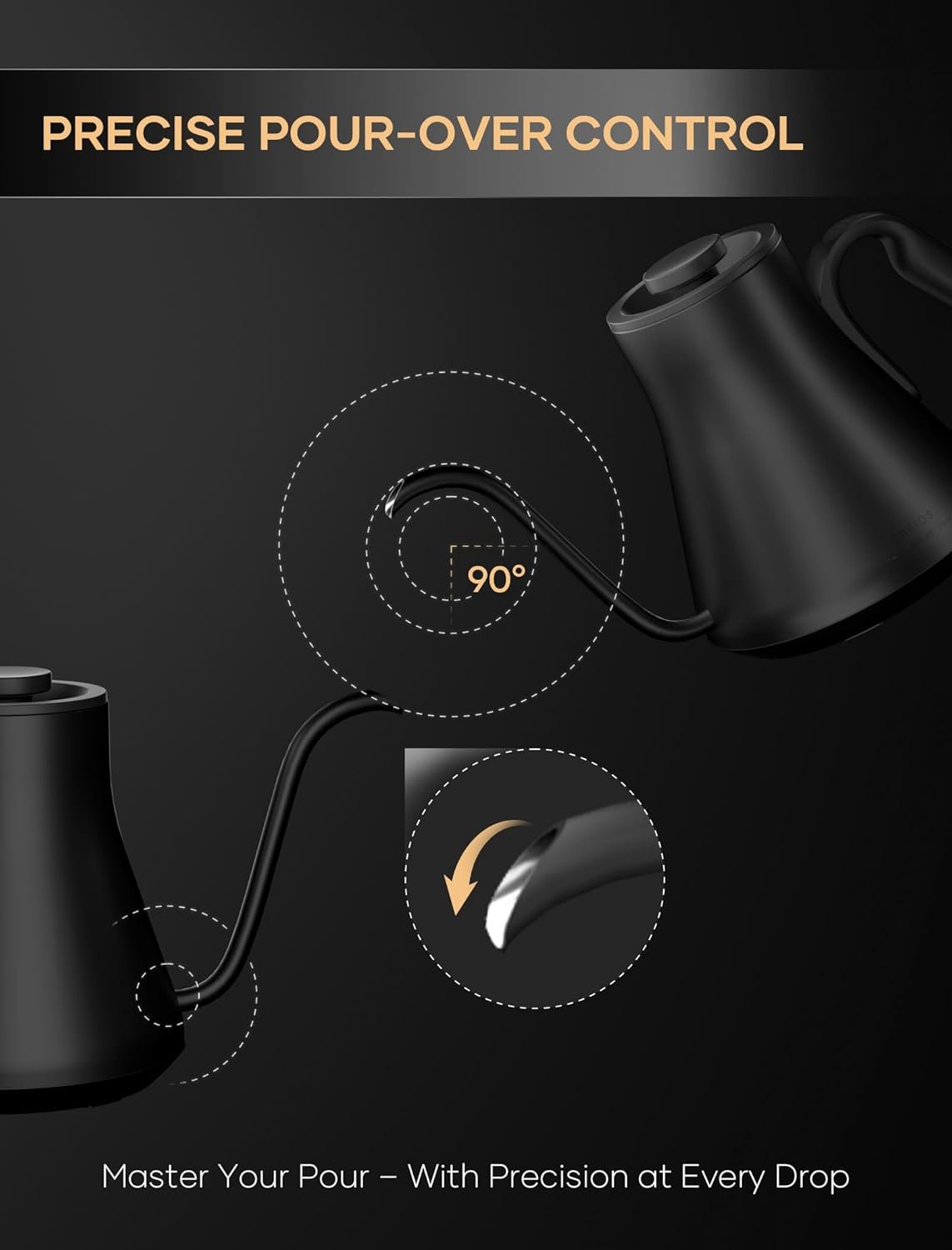 0.65mm Gooseneck Spout – Due to the water flow speed directly affecting the flavor and taste of pour-over coffee, we designed a unique fine gooseneck spout. It is easier and more friendly to control the water flow speed during make pour-over coffee.