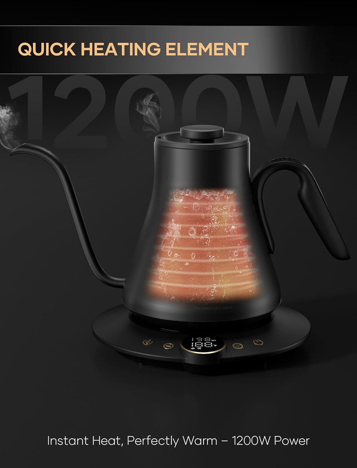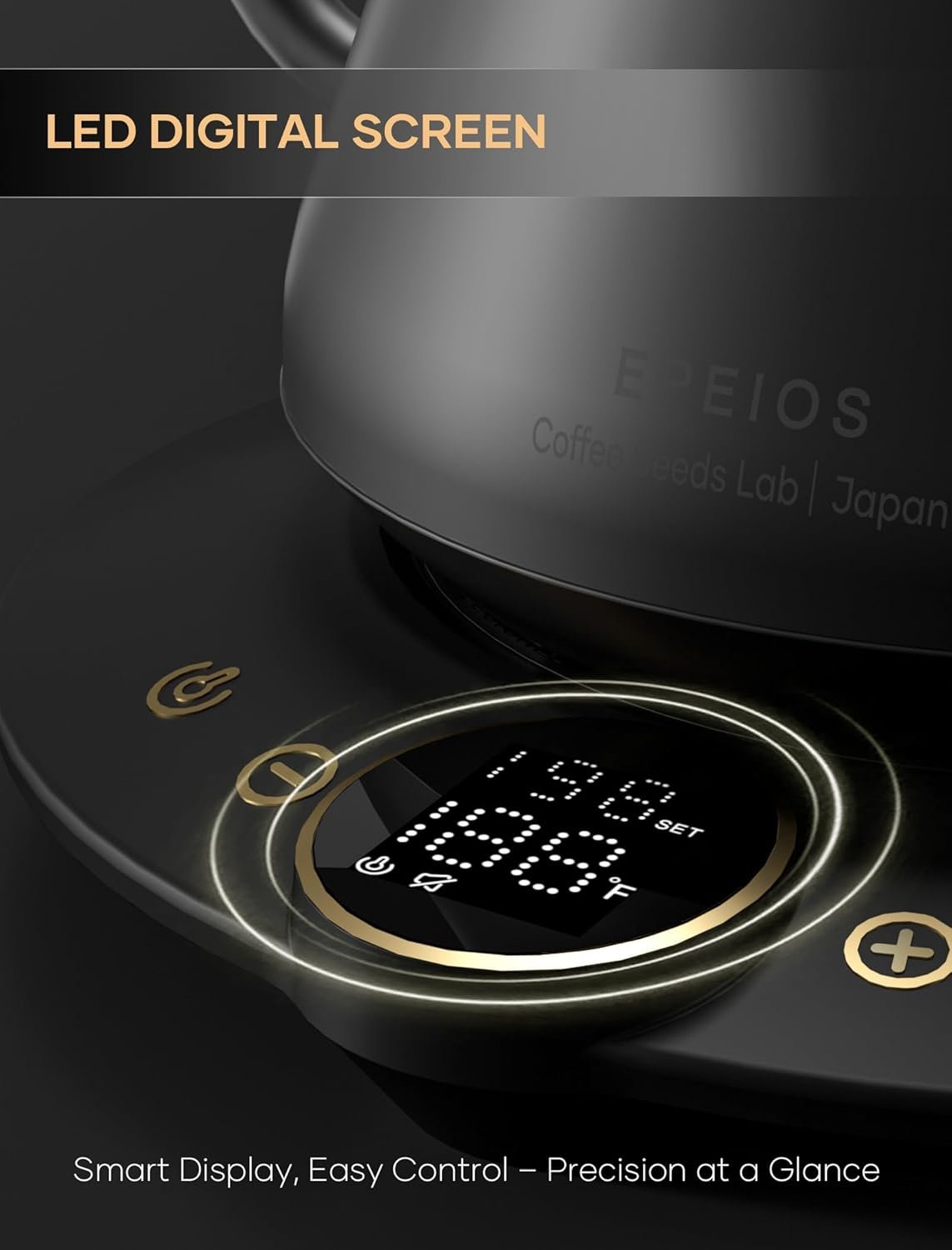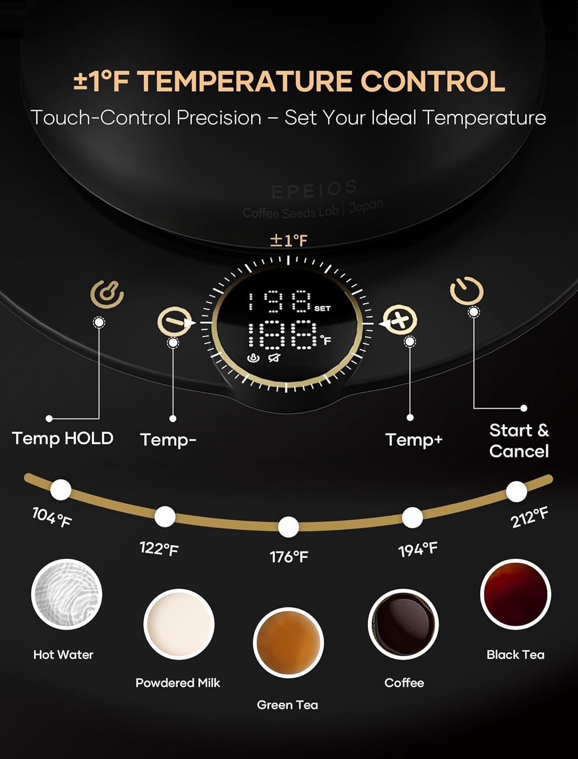 ±1℉ Temperature Accuracy – The intelligent base’s built-in temperature control program. The program will adjust the heating power when the water temp approaches the desired temp according the temp probe detects the temp change.