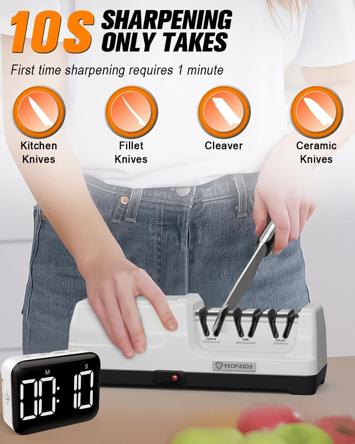 🍋【3-Stage Sharpening】3-stage kitchen knife sharpener electric with coarse grinding, fine grinding and polishing functions. 360# grinding wheel made of industrial diamond for repairing large gap or restore basic sharpness; 600# grinding wheel made of industrial diamond for removing burrs and abrasive marks on the knife edge after rough grinding; 1000# grinding wheel made of 100% resin for smoothing and polishing the knife edge.