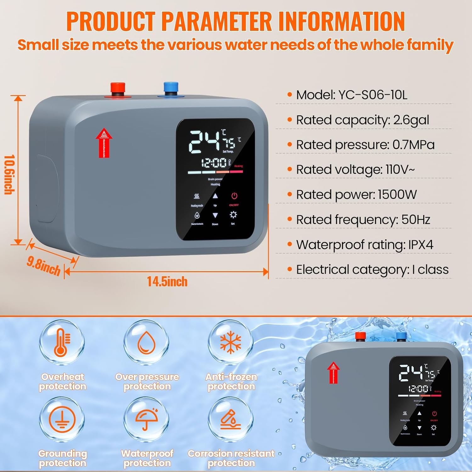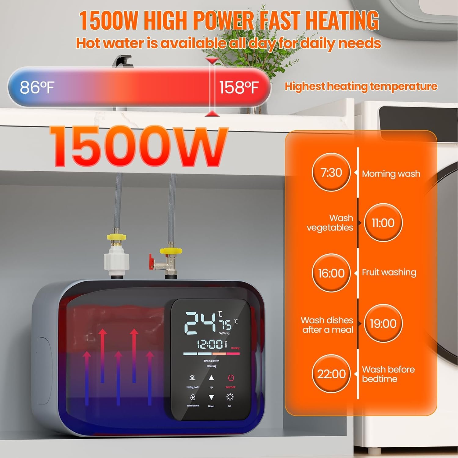 【Electric Mini Tank Water Heater】-The Electric Mini Tank Water Heater,1500-watt heating system delivers instant hot water in seconds without preheating,with more safety protection such as anti-freezing protection,over heating protection, 4 gallons of hot water can be output per minute. The maximum temperature raise is 158 °F.