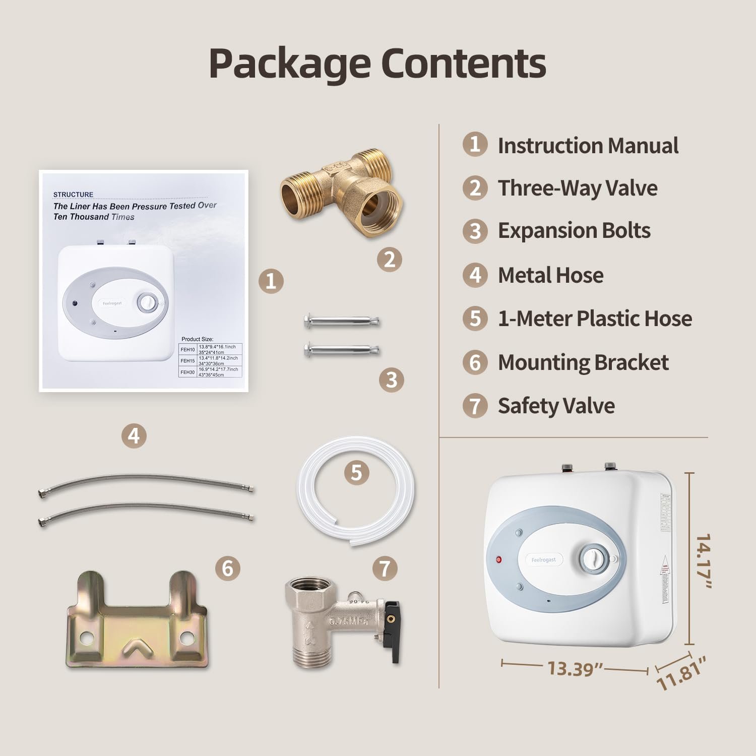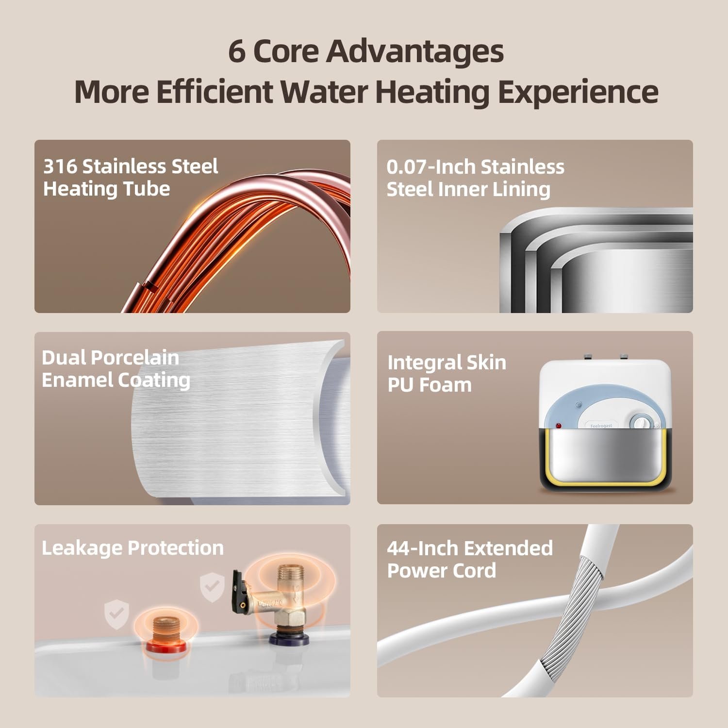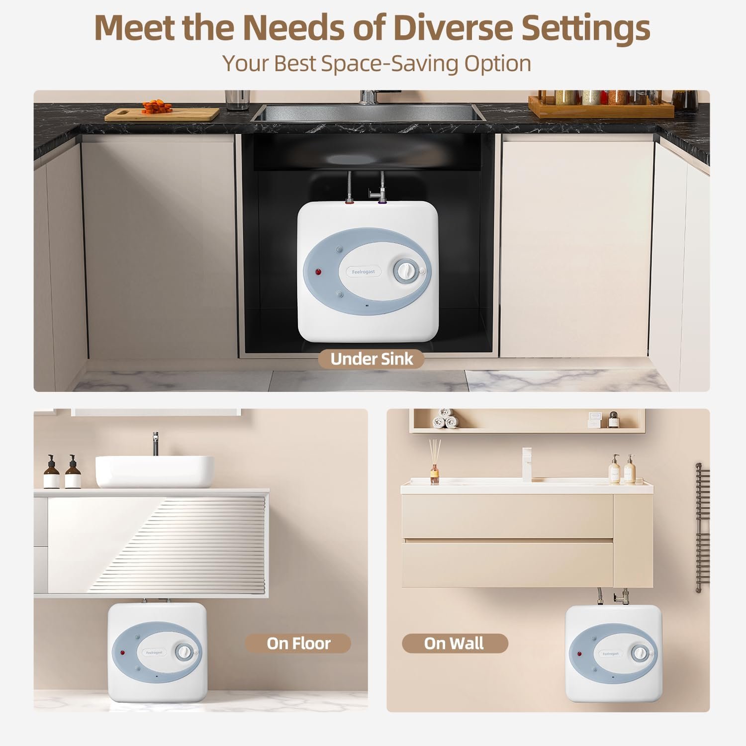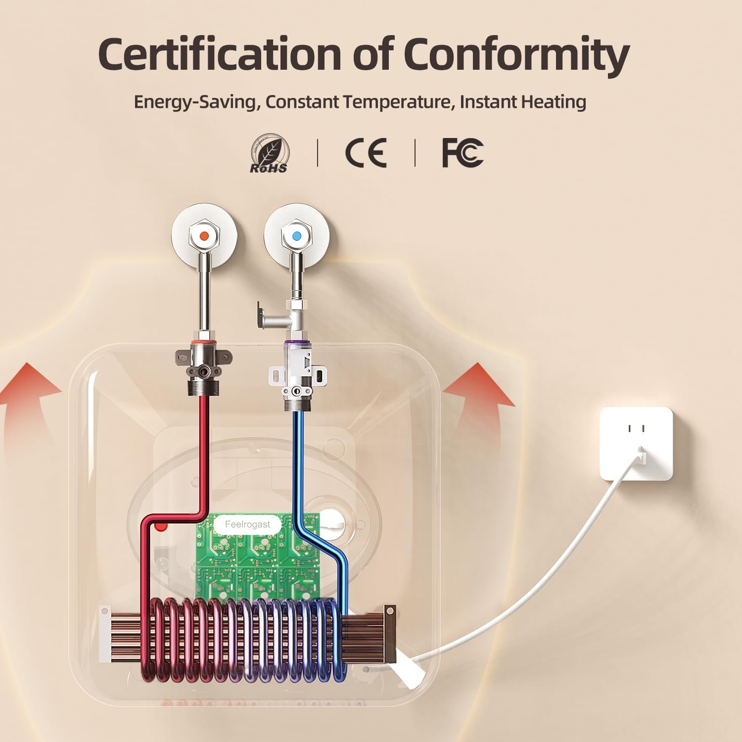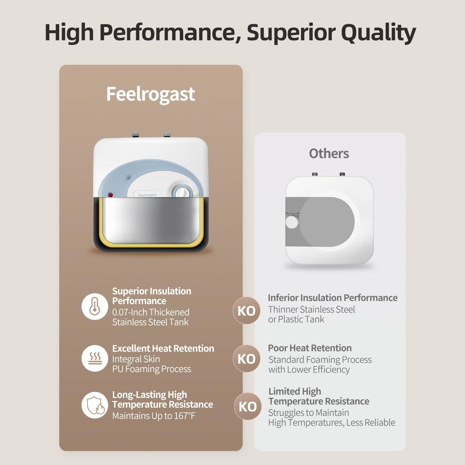 [Instant Hot Water & Rapid Reheat] Feelrogast electric mini tank water heater rapidly heats water, minimizing your wait time and efficiently meeting your hot water needs. The 316 stainless steel heating element achieves up to 99% heat utilization. Temperature is adjustable from 86-167°F for simple, convenient operation.