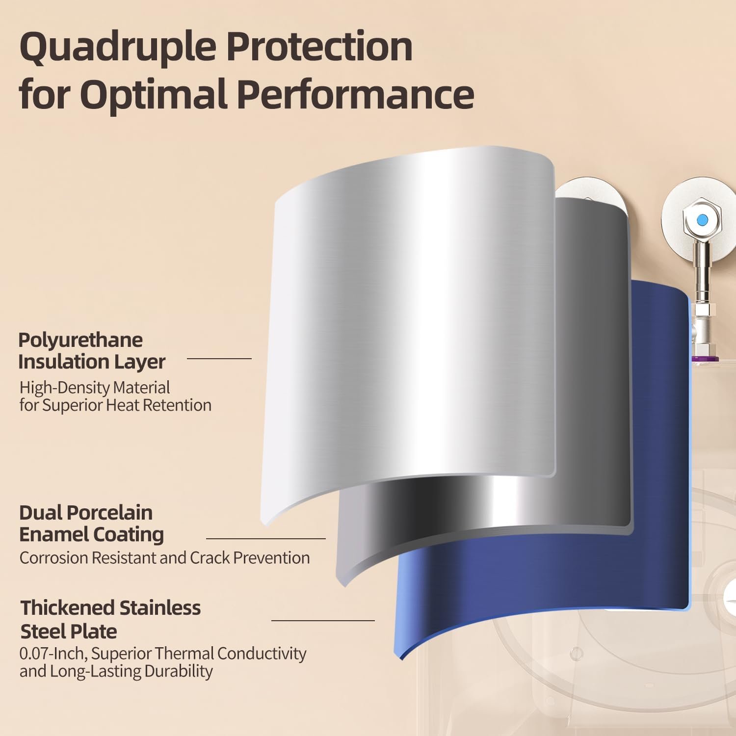 [High quality and durability] This product is CE, ROHS, and FCC certified, ensuring safety and reliability. The 1.88mm thick stainless steel tank is pressure-resistant and explosion-proof, with a 500-800μm enameled layer using a unique double process to prevent cracking, rusting, and leaks, for long-lasting performance.
