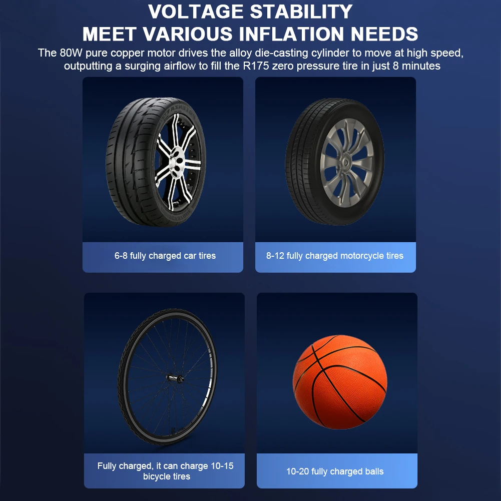 1. High-Power Copper Core: The electric tire inflator features a high-speed copper motor driving an alloy cast cylinder for stable and powerful inflation. With large displacement and turbocharging technology, it ensures efficient and robust air compression.