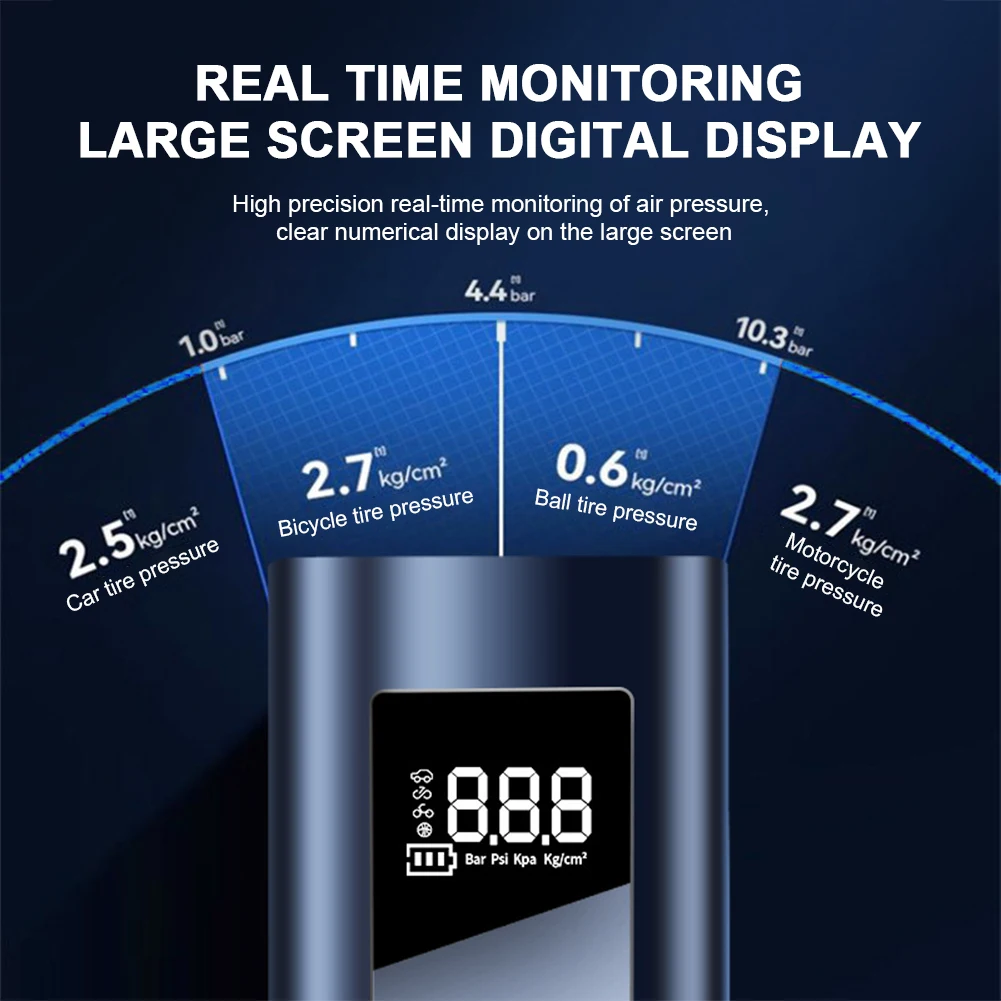 3. Real-Time Monitoring: The portable air pump comes with a large digital display for high-precision pressure monitoring. It provides real-time, clear readings, making it easy to see and understand the tire pressure at a glance.