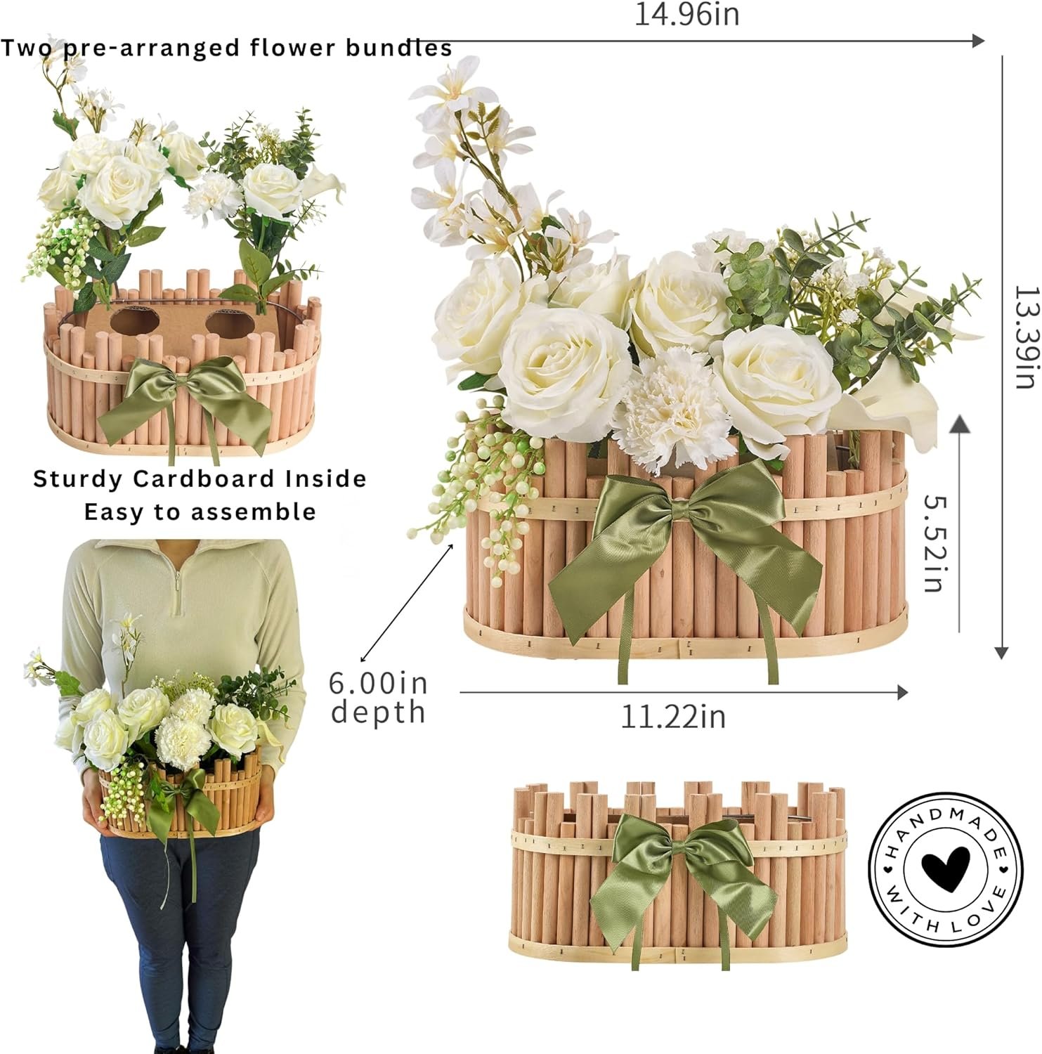 Includes two pre-arranged artificial flower bundles for easy assembly.Elegantly set in a rustic handmade wood basket with a charming bowknot.Features a sturdy cardboard stand inside to support and arrange flowers for a flawless look securely.Comes with a folded Thank You card featuring easy assembly instructions that also doubles as a lovely decor accent