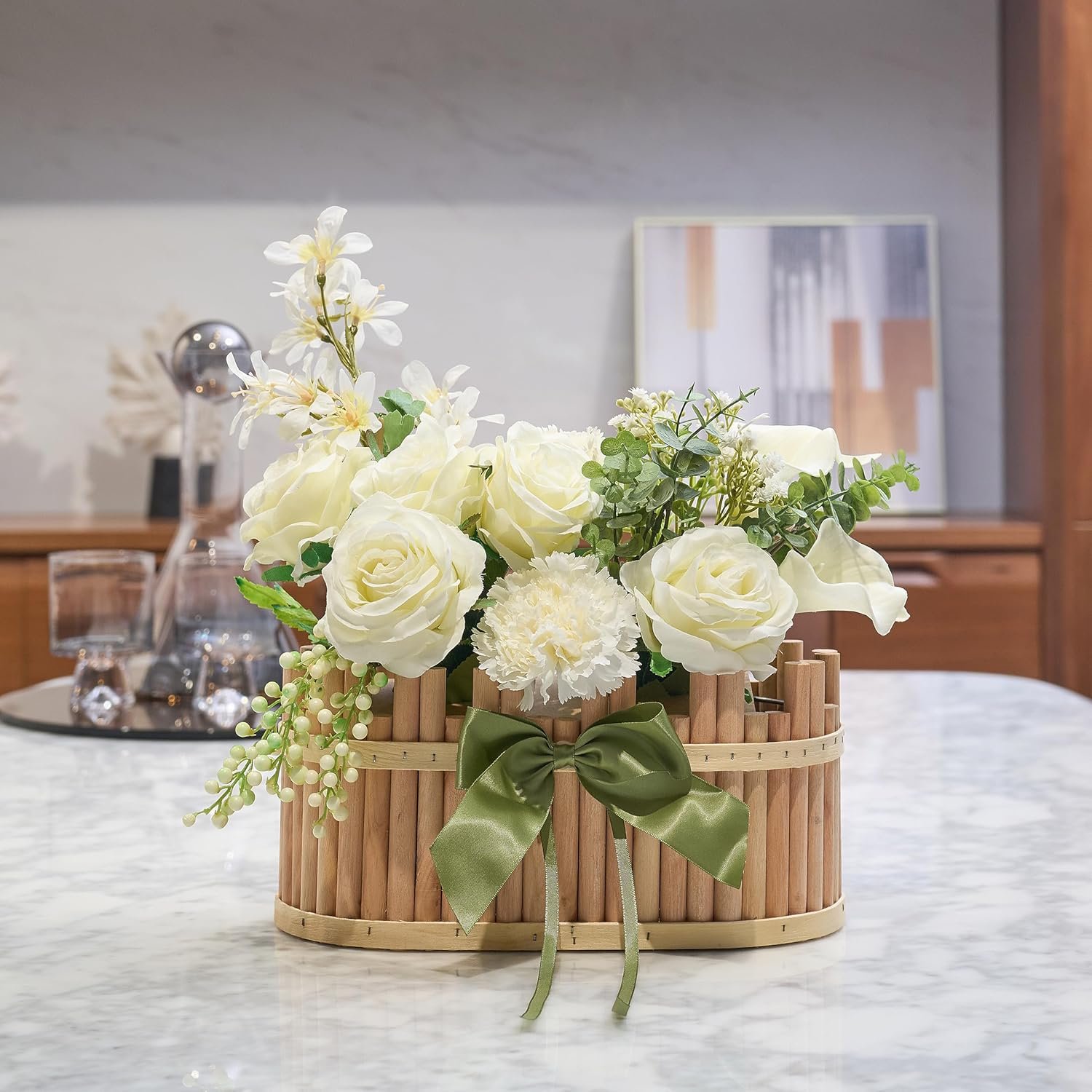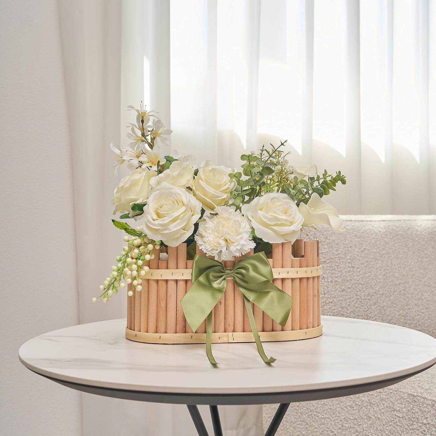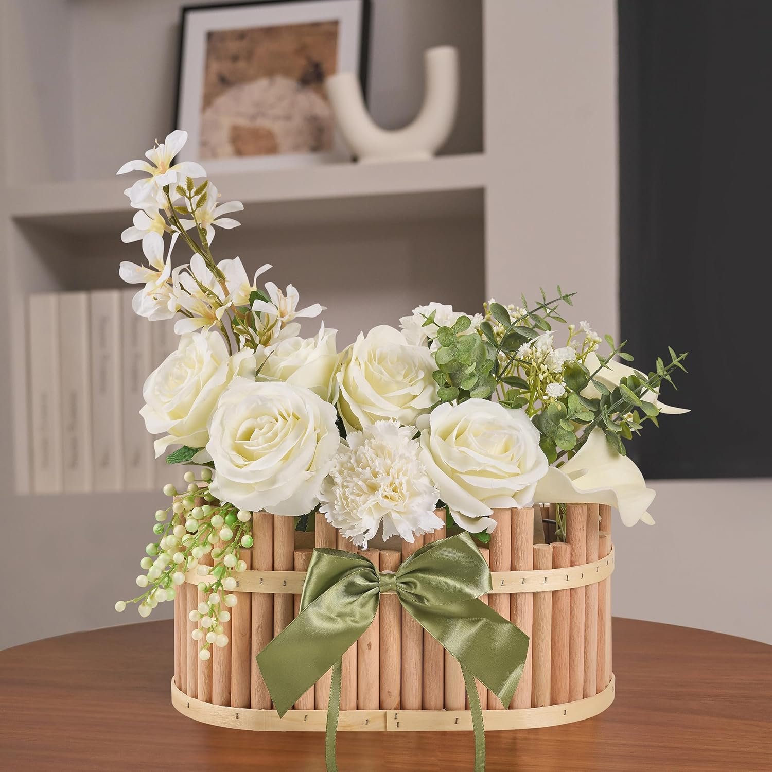 Artificial Flowers with Handmade Basket Elevate your space with this stunning flower arrangement of white roses, artificial flowers, and high-end faux plants, elegantly arranged in a rustic wood basket with a charming bowknot. Inside, a sturdy cardboard stand supports the flowers, making it easy to arrange them perfectly. Perfect for centerpieces for tables ideas, this piece adds elegance to any room, whether it’s used for fireplace decorations for living room, coffee table decor for living room, or as a beautiful addition to your dining table decor and accessories.