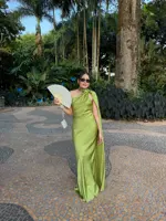 The dress is precise, good fabric, good finishes. I ordered a size M and it fits me very well. I think ordering one size larger than what you normally wear is fine, especially if you have a wide hip. It’s easy to iron, the fabric doesn’t have any strange smells, the color is beautiful just like the image. I’m 1.63 meters tall and it fits right at my feet without dragging.