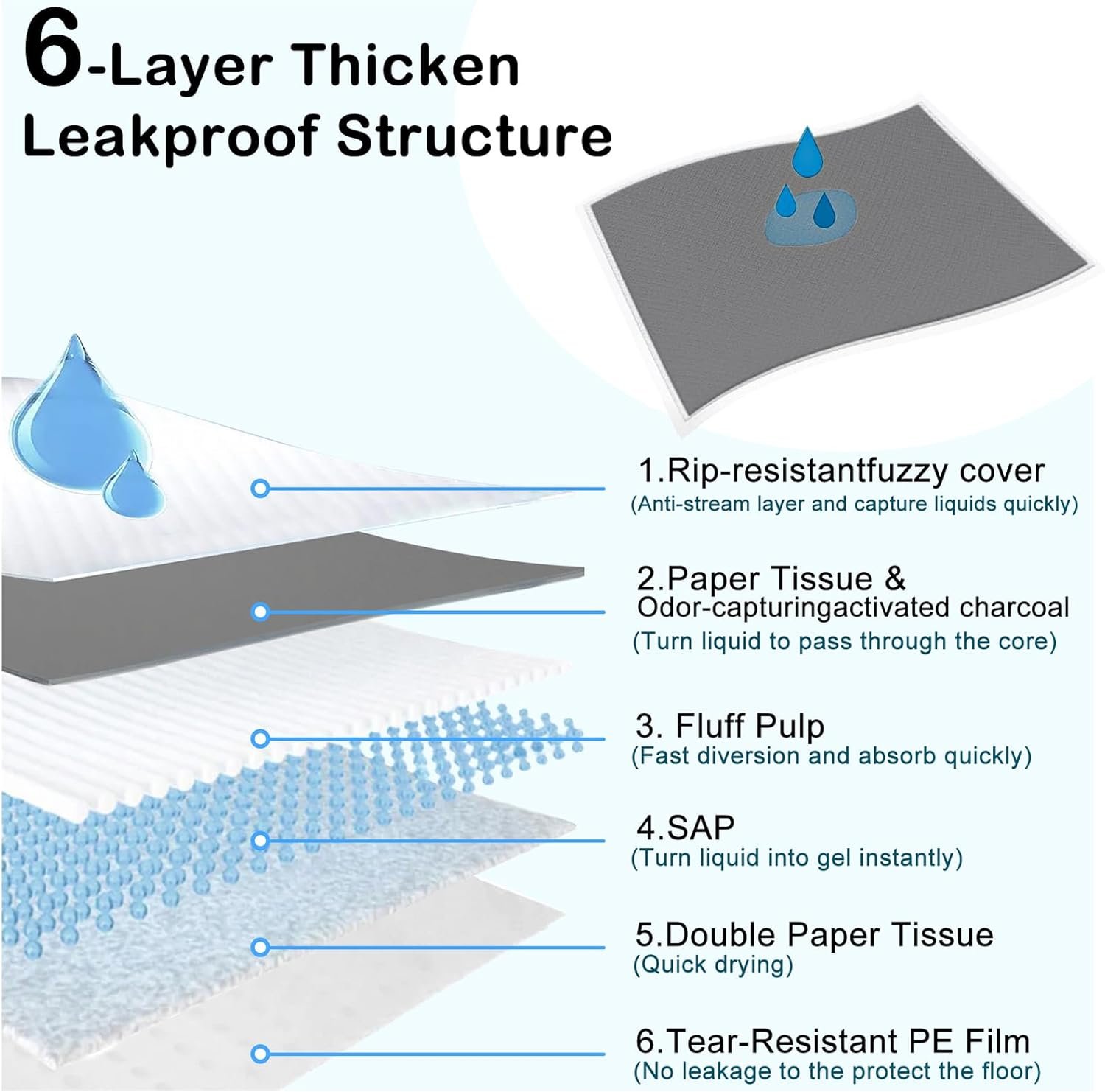 【Super Absorbent & 6-Layer Protective Design】ELEGX Pet Training Pads are always made with durable 6-layer construction. Powerful liquid-absorbent polymer technology makes each pad more absorbent than ordinary dog pads on the market. With an additional 12 grams of imported polymer material and 60 grams of fluffy pulp, the polymer core quickly turns urine into gel. Keep pets dry and clean throughout the day