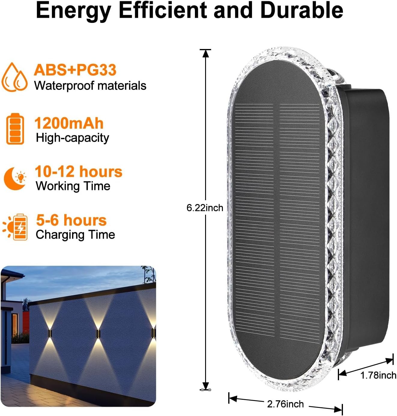 [Ultra-bright LED Bead] The fence solar lights features unique upper and lower lens LED lamp beads that concentrate light into two vibrant beams, brightening the eaves above and the paths below. The surrounding halo of crystal light from the solar panel not only enhances visibility but also creates a stunning atmosphere, reducing the need for additional light sources