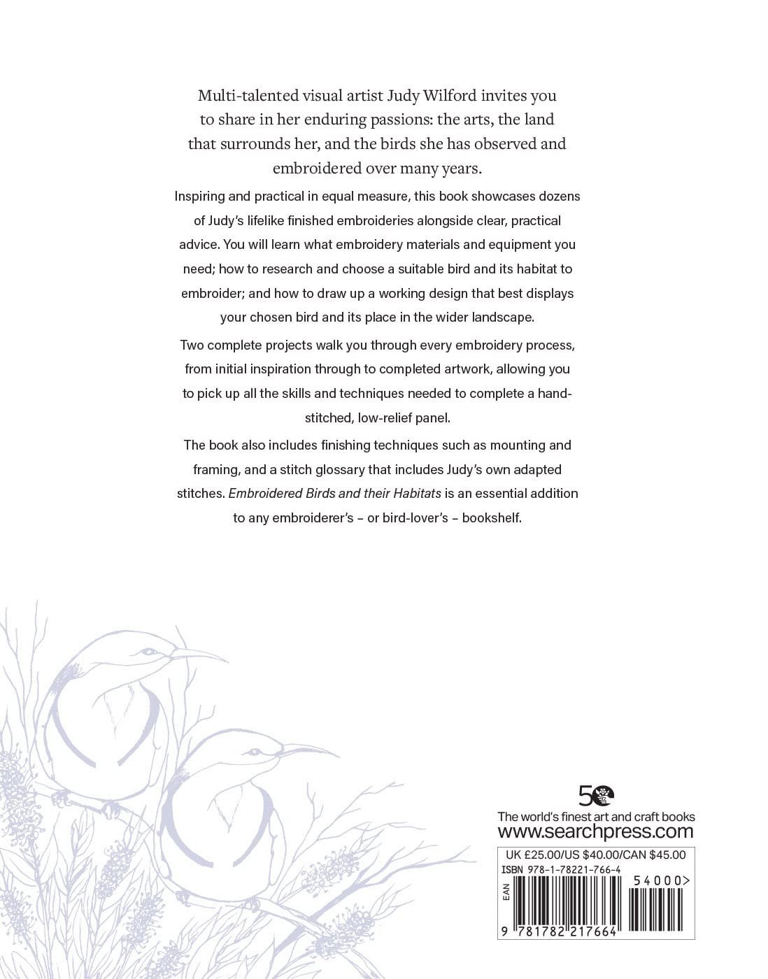 This stunning new title from master embroiderer Judy Wilford explores her fascination with birds and the ways they interact with their surroundings. Through research she turned her collection of rough sketches and notes into drawings and finally the beautiful embroideries featured in the book.