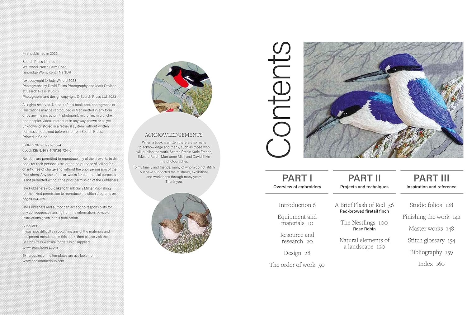 The book also includes finishing techniques such as mounting and framing and a stitch glossary that includes Judy’s own adapted stitches. This book is an essential addition to any embroider’s – or bird-lover’s – bookshelf.