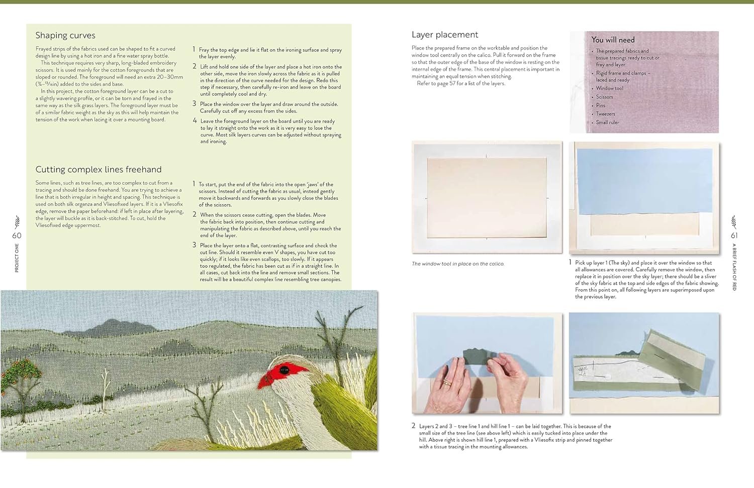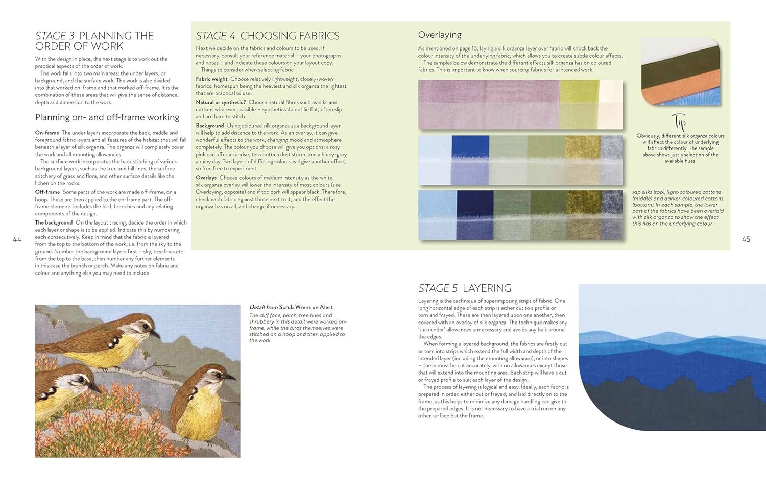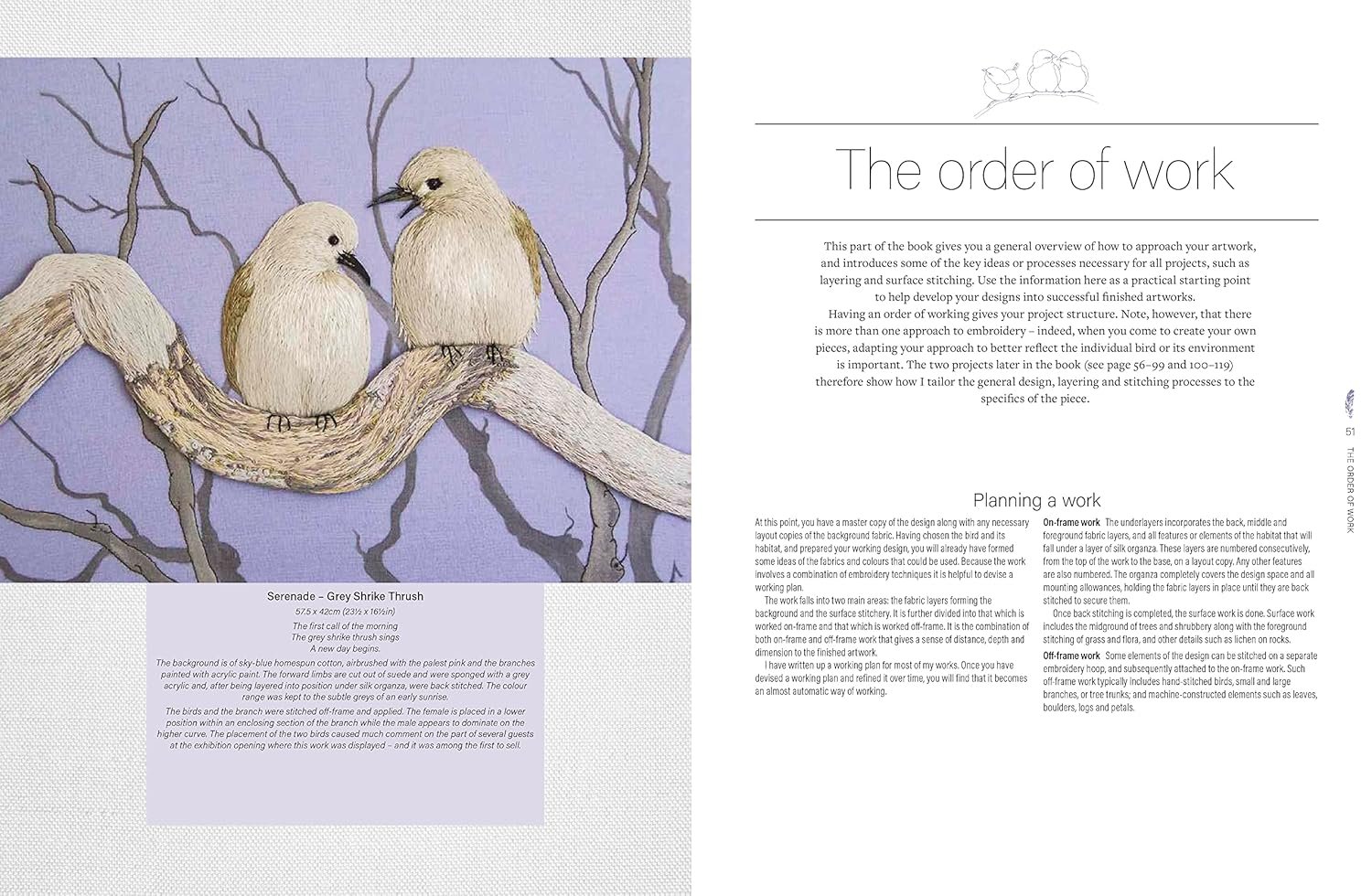 Part 1 covers the basic requirements of what you need, including design requirements, embroidery materials – fabrics, needles and threads – equipment, rigid frames, and your workspace. It also includes a section on research and choosing a suitable bird and its habitat, concluding with a project that guides the reader through the entire process from inspiration through to working design, giving all the skills and techniques needed to complete a hand-stitched, low-relief panel based on birds and habitats.