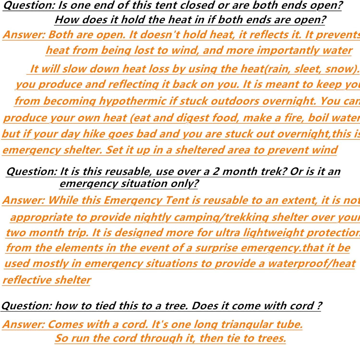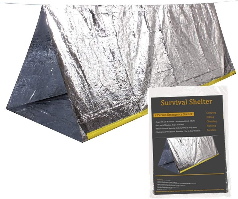 Emergency mylar thermal shelter tent: Come with 59 X 98.4inch/8′ x 5′ 2-person mylar thermal shelter, large size can support full body protection. Practical and convenience. It’s a tube tent that comes with a “rope”/ridge line to run under the top so it will keep its shape