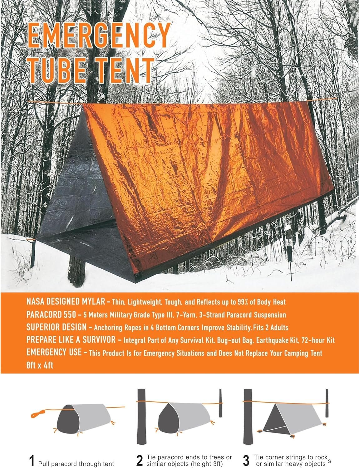 Quick Set-Up: Our wind resistant and waterproof emergency tube tent sets up fast; just run the 20 feet paracord through the tent and tie it up between two trees, then use rocks or gear to anchor the corners, and climb in. Instructions are included in each bag. If no trees are available, the 8×5 foot emergency storm shelter can also be used as an emergency sleeping bag, blanket, bivvy bag, or bivvy sack.
