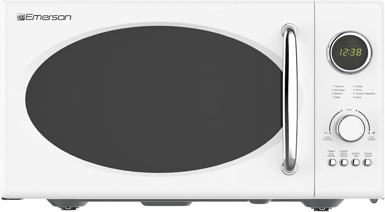 Emerson MWRG0901W Retro Compact Countertop 800W Microwave Oven with 1,000W Grill Function, LED Display 5 Power Levels, 8 Auto Menus, Glass Turntable and Child Safe Lock, 0.9 Cu. Ft, White