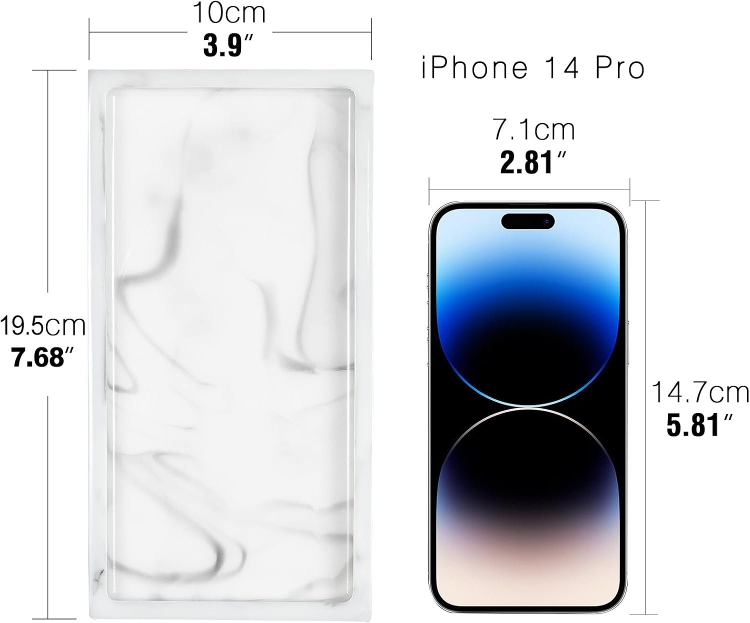 Size: This bathroom vanity tray measures 7.68 x 3.94 x 0.75 in (inner size 7.1 x 3.4 x 0.4 in) . Note: Due to the handmade craftsmanship, the marble pattern on the tray you bought may be different from the picture and the size is slightly different too. Each tray is unique, please in kind prevail.