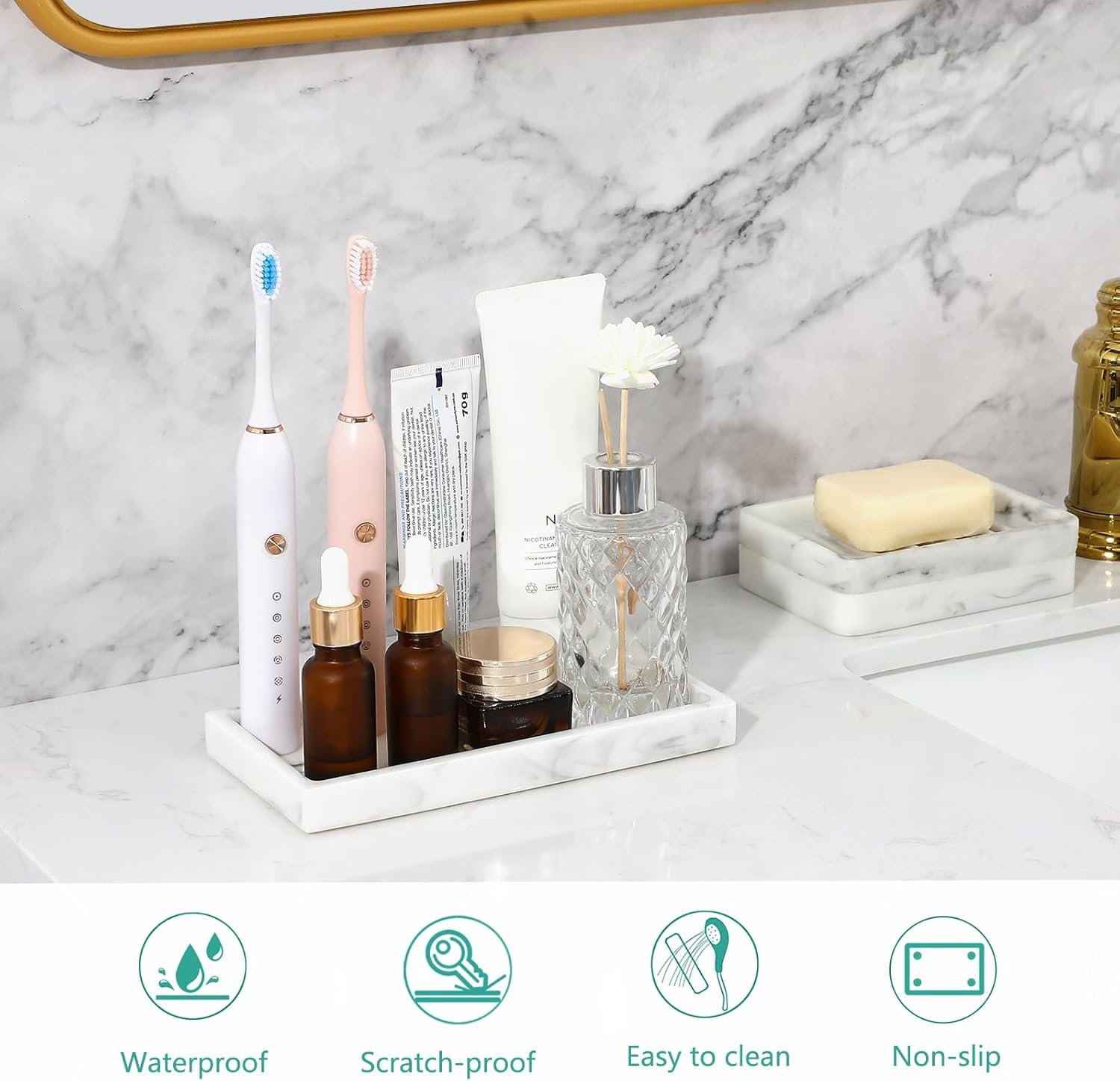 Emibele Bathroom Vanity Tray, Small 8″ Rectangular Resin Kitchen Soap Dresser Jewelry Dish Tray Bathroom Countertop Organizer Tray for Cosmetic Perfume Candle, Mini, White Marble