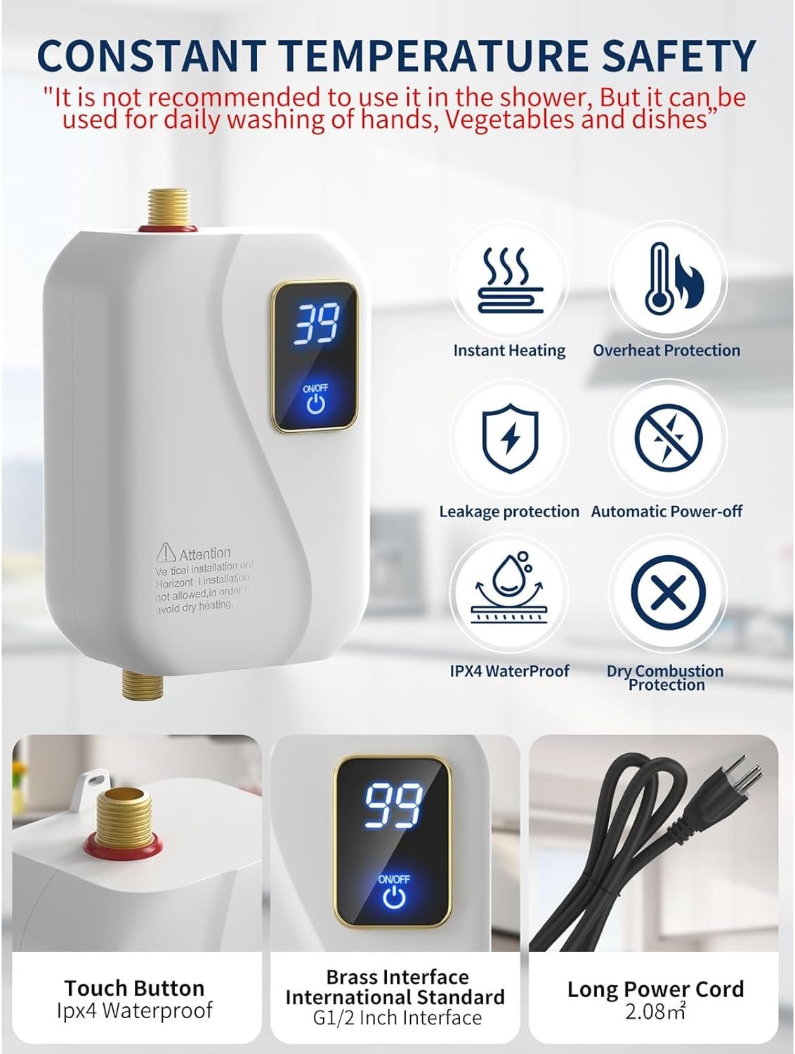 Perfectly suited for kitchen and bathroom use, this heater provide immediate hot water, making it practical for different household needs.