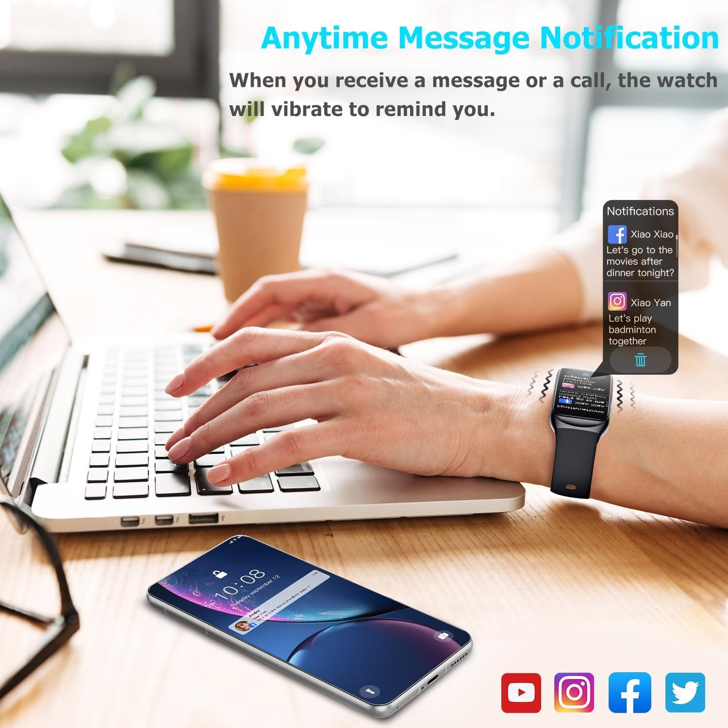 【Call and message notifications】After connecting your phone, you can receive incoming calls, text messages and SNS notifications (including Facebook, Twitter, WhatsApp and Instagram) directly on your wrist. When your phone’s Bluetooth is turned on, if you receive a message, the watch will vibrate to remind you and you can check the specific information