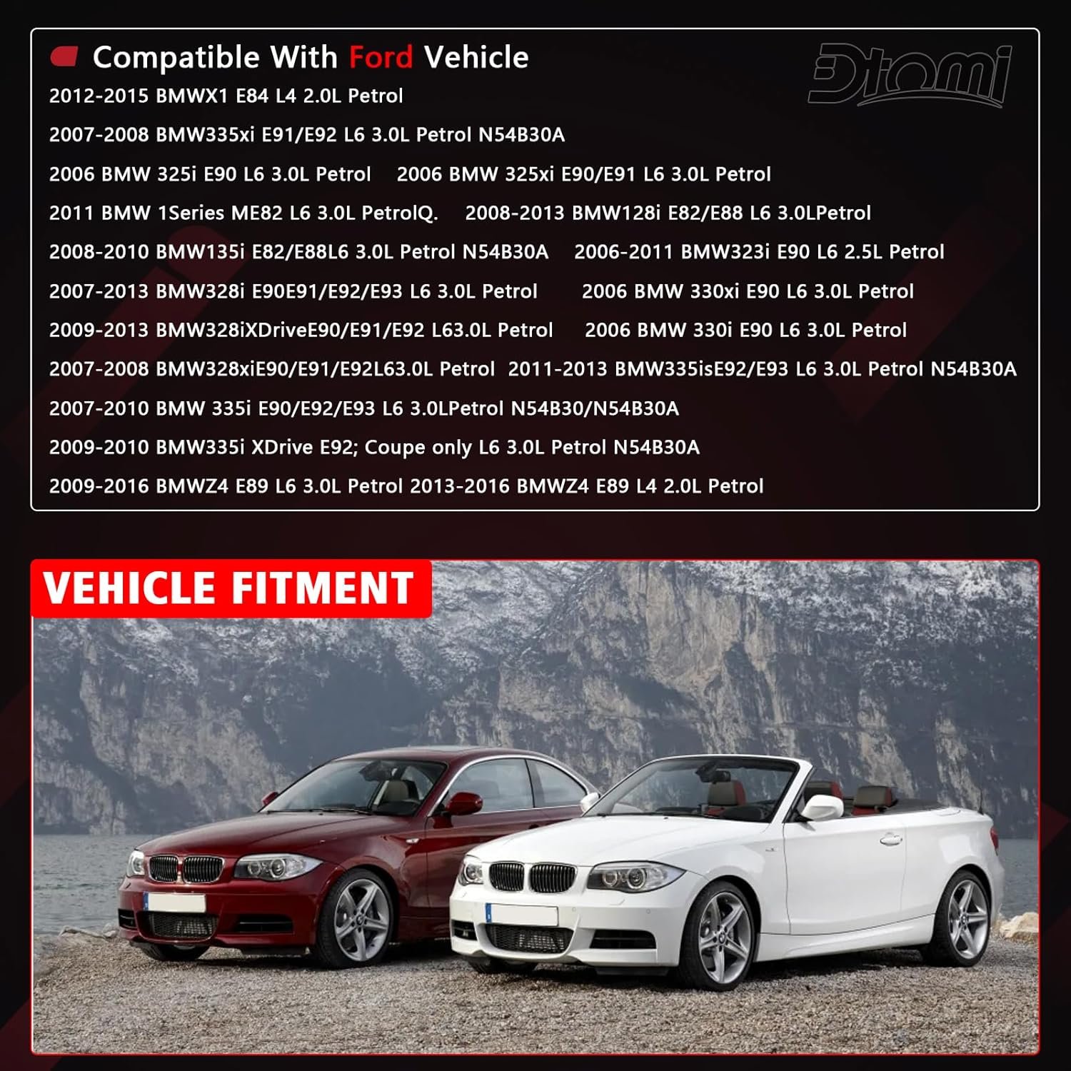 【FIT FOR 】 – Compatible With BMW Vehicle 2011 1 Series M, 2012-2015 118i, 2005-2012 120i, 2016 120i, 2008-2013 125i, 2008-2013 128i, 2006-2010 130i, 2008-2010 135i, 2006-2011 323i, 2006-2013 325i, 2006 325xi, 2007-2013 328i, 2009-2013 328i xDrive, 2007-2008 328xi, 2006-2007 330i, 2006 330xi, 2007-2010 335i, 2009-2010 335i xDrive, 2011-2013 335is, 2007-2008 335xi, 2012-2015 X1, 2006-2016