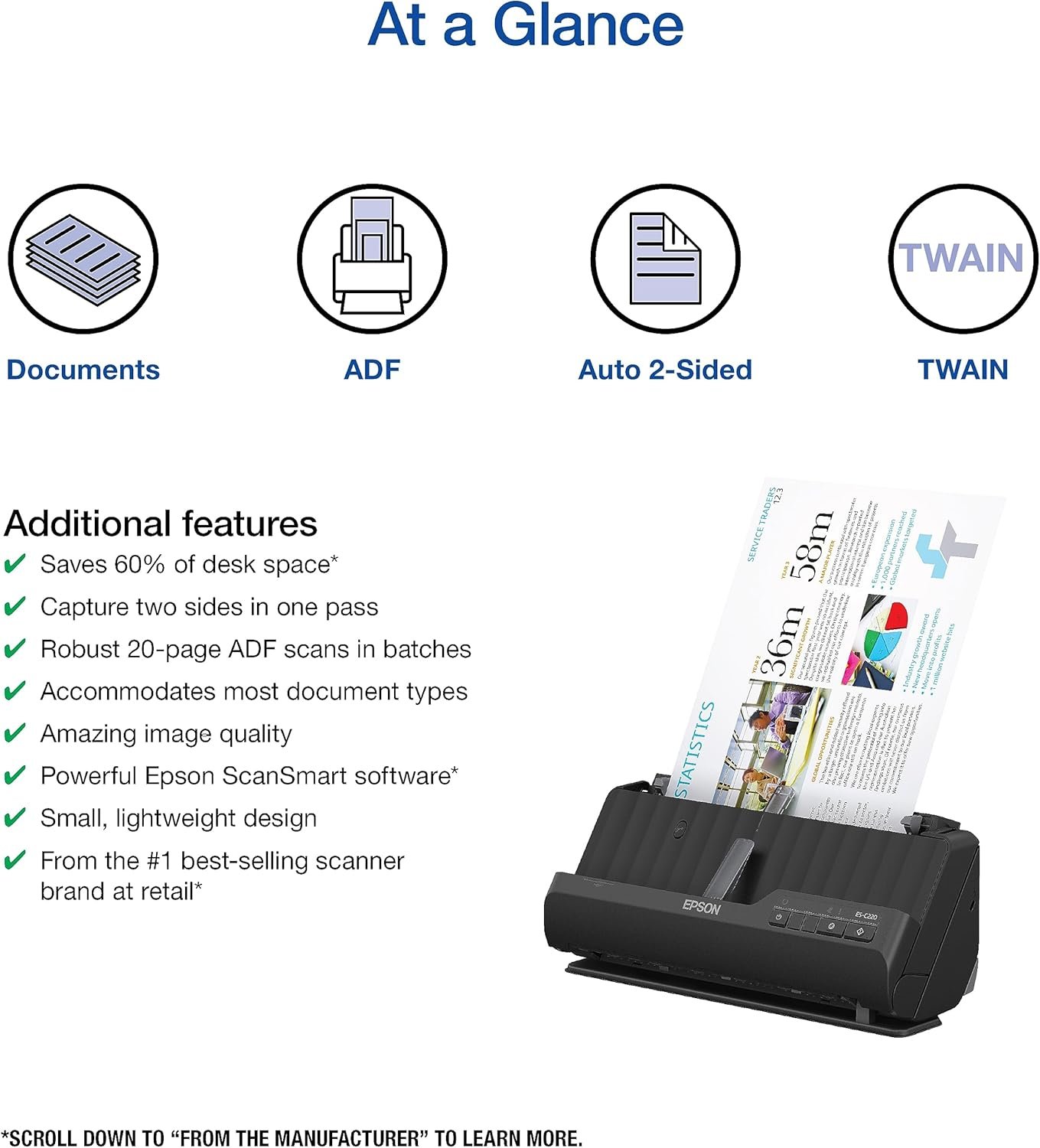 A compact modern wonder, the WorkForce ES-C220 keeps things simple with its intuitive design and exceptional flexibility. With the ES-C220, you can organize stacks of documents and make keeping piles of paperwork for your records a thing of the past. Ideal for the home or office, this easy-to-use scanner is the definition of innovation, saving 60% of desk space (1) and scanning two sides at once as fast as 30 ppm/60 ipm (2). Offering a robust solution to managing your workflow, the included Epson ScanSmart software (3) allows you to preview, email and upload your scans. In addition, help save valuable time with automatic file name suggestion for streamlined file management. The scanner features a 20-page Auto Document Feeder that makes it easy to scan in batches. In addition, the versatile ES-C220 scans papers of varying sizes up to 8.5″ x 120″. Maintain amazing quality with intelligent image adjustments such as cropping, paper skew correction and dirt detection. From the #1 best-selling scanner brand at retail (4), the ES-C220 proves bigger isn’t always better. 1. In vertical path scanning position compared to Epson WorkForce ES-400 II with trays extended. | 2. Based on letter-sized scans at 300 dpi in Black-and-White, Grayscale or Color Mode. |3. Requires Internet connection for Epson ScanSmart software download and installation on a connected Windows PC or Mac. | 4. Source: The NPD Group, Inc., Retail Tracking Service, U.S. & Canada, Scanners, Aug. 2021 – Jul. 2022. | 5. Optional carrier sheet required.