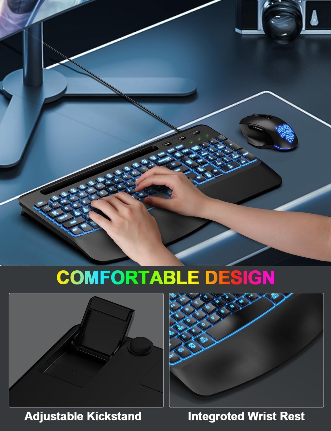 ▶【COMFORTABLE AND ERGONOMIC】: Wide plam rest supports wrist and the foldable stand on the back of the keyboard helps keep your wrists in a comfortable position, improving your body posture and reducing wrist pain and fatigue after long work hours