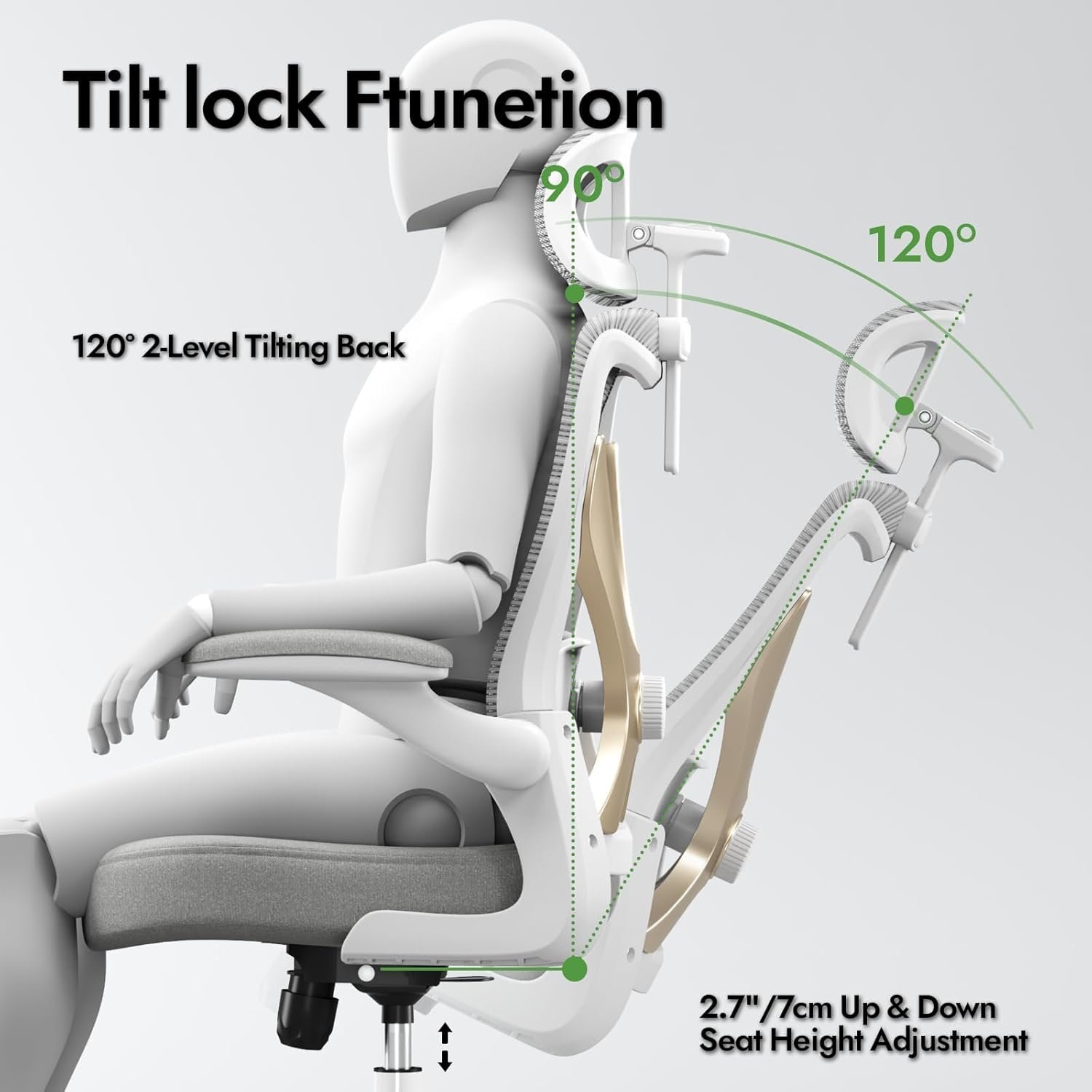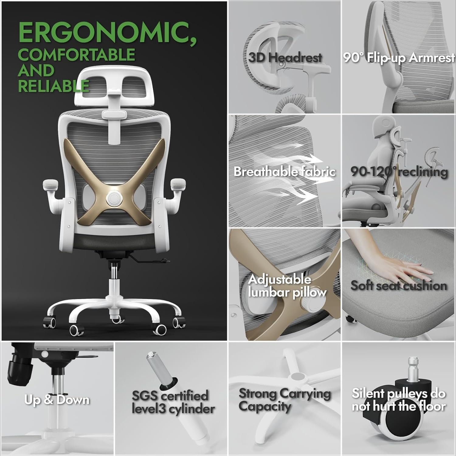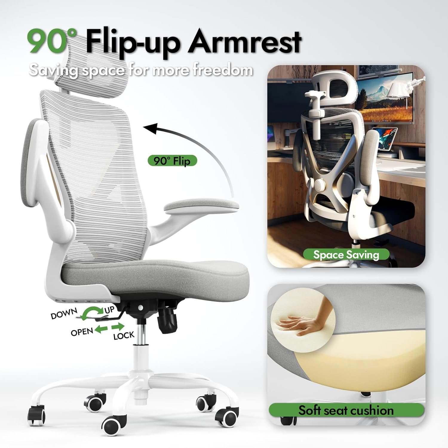 Ergonomic Office Chair: Experience unparalleled support with our ergonomic office chair, designed to provide comprehensive assistance for your head, back, hips, and arms. Tailored lumbar support ensures your comfort and well-being. Suitable for people of about 5’5″ to 6’2″. Easily adjust seat height, headrest, backrest, and flip-up arms to cater to diverse needs, offering comfortable support during extended periods of sitting