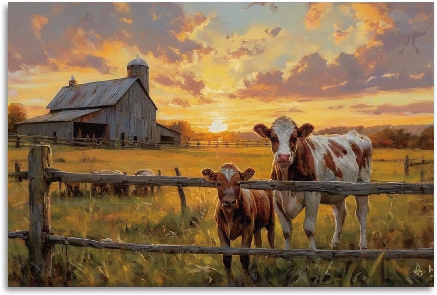 Transform your living space with this captivating 16×24 inch canvas wall art featuring a serene farm landscape at sunset. The artwork showcases a classic rustic barn silhouetted against a dramatic golden sky, with two charming cows standing by a wooden fence in the foreground. Every detail captures the essence of countryside living – from the weathered barn wood to the warm, glowing sunset clouds and the peaceful pasture bathed in evening light. This unframed canvas print brings timeless farmhouse charm to any room, making it perfect for living rooms, bedrooms, or dining areas. The rich colors and nostalgic scene make this piece an ideal addition to country-style home décor, adding warmth and character to your walls. The high-quality canvas print preserves all the intricate details of the original artwork, from the rustic fence posts to the subtle evening shadows across the pastoral landscape.