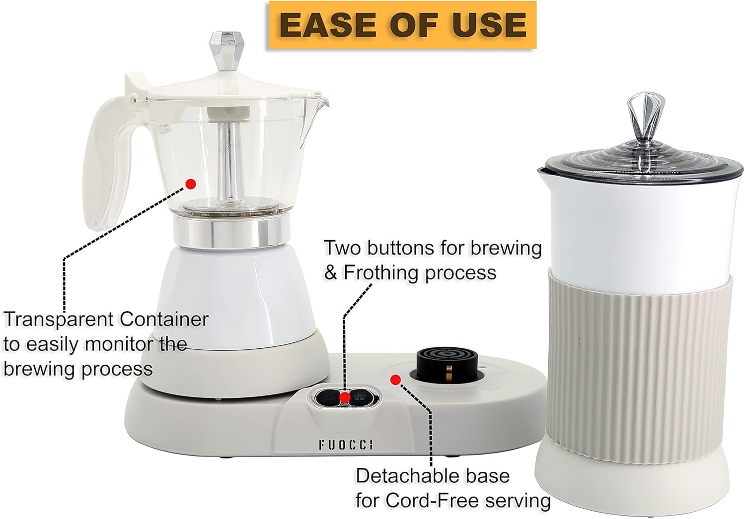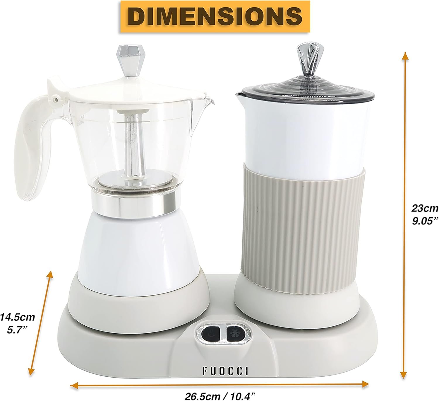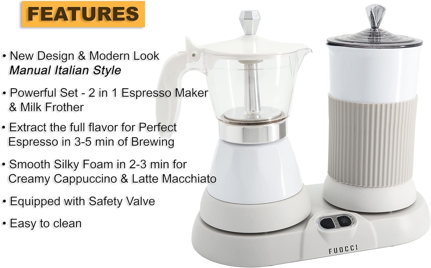 NEW DESIGN & MODERNITY: Great choice of electric espresso maker with milk frother ! Its sleek, modern design and Italian-inspired style makes this italian coffee maker electric moka pot and frother perfect addition to your home, office, or any space and with its innovative & user-friendly design, saves valuable counter space compared to other electric espresso coffee maker with frother. Enjoy delicious espresso with perfectly frothed milk at the touch of a button (Please review the below info for capacity & specs )
