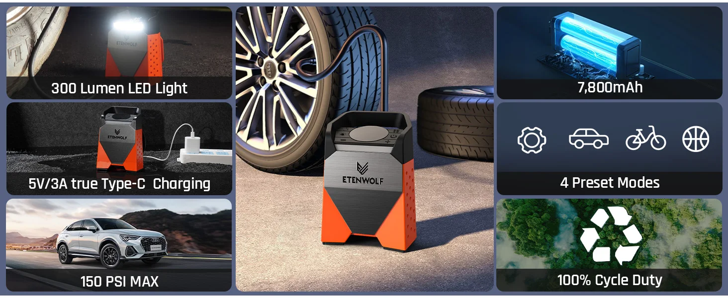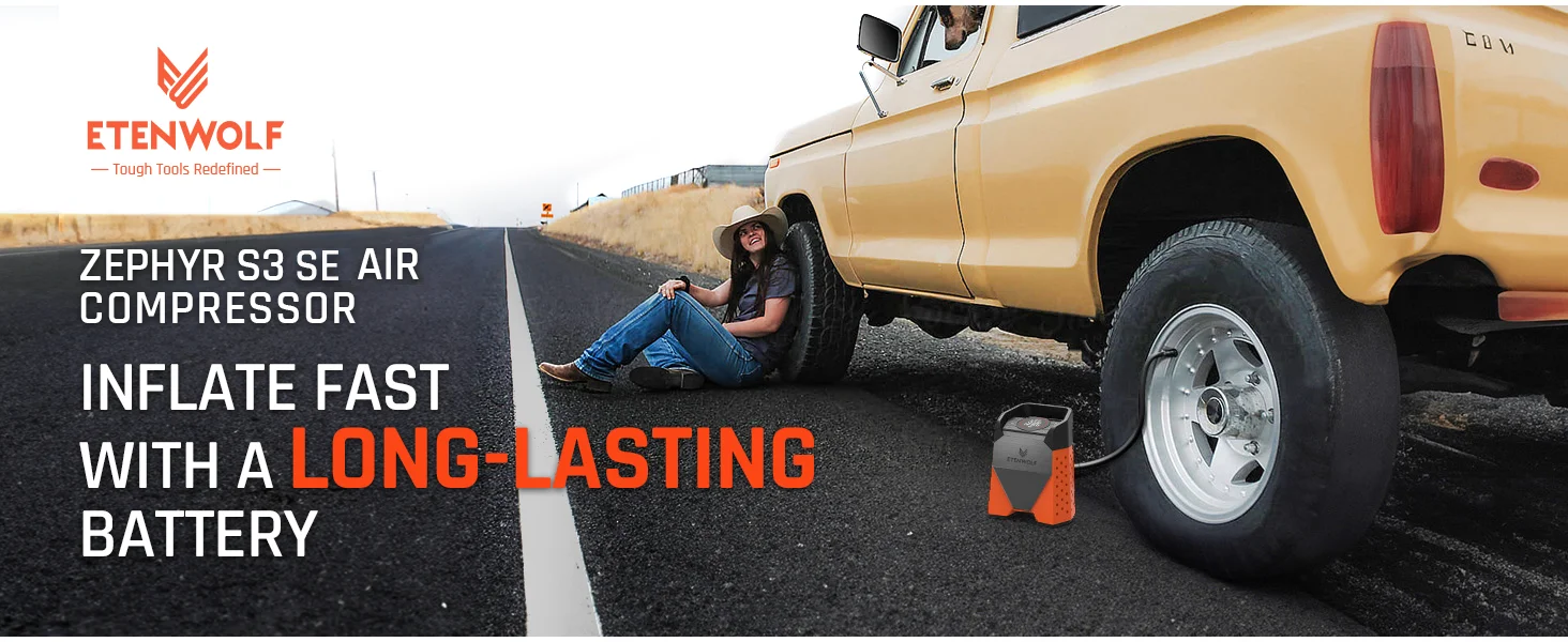ETENWOLF ZEPHYR S3SE Portable Air Compressor 100% Duty Cycle Car Tire Inflator 7800mAh for Cars, Motorcycles, Bicycles Balls