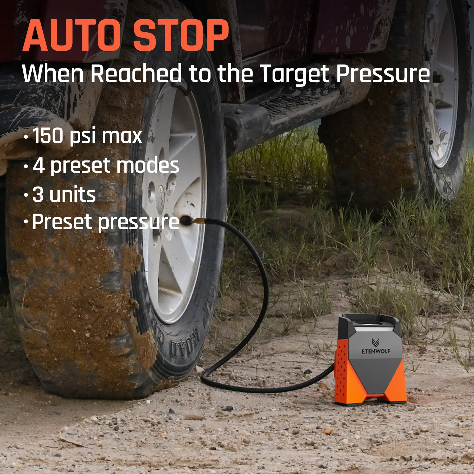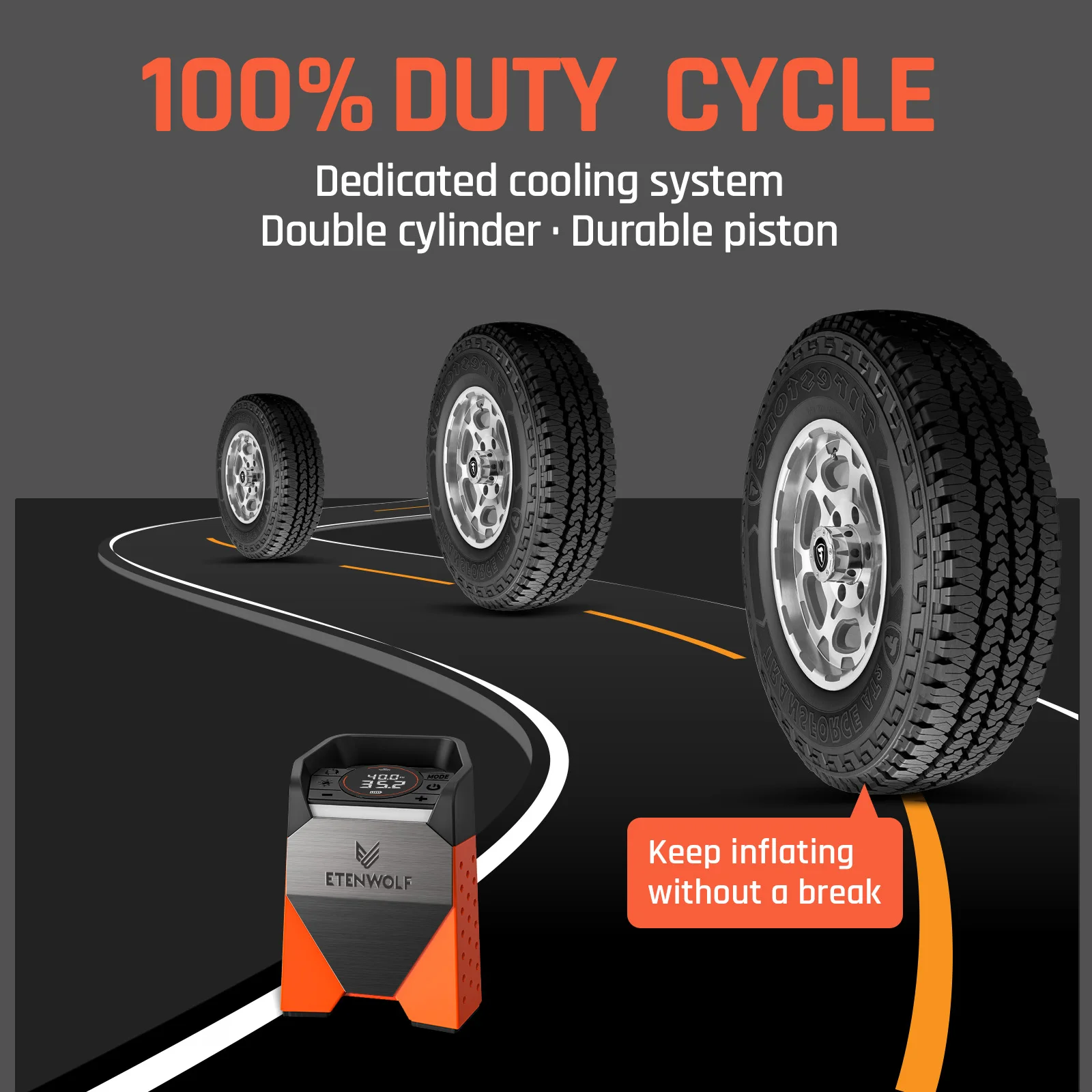 3.100% duty cycle air pump, can continuously inflate your large-sized tires