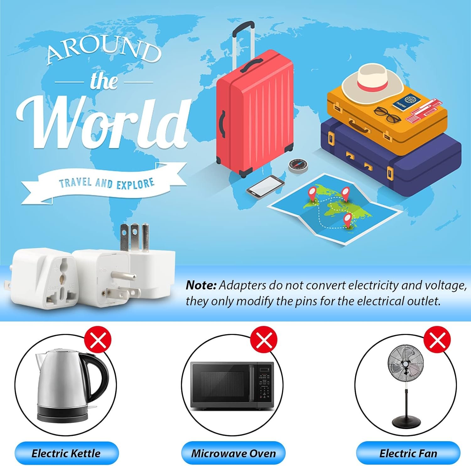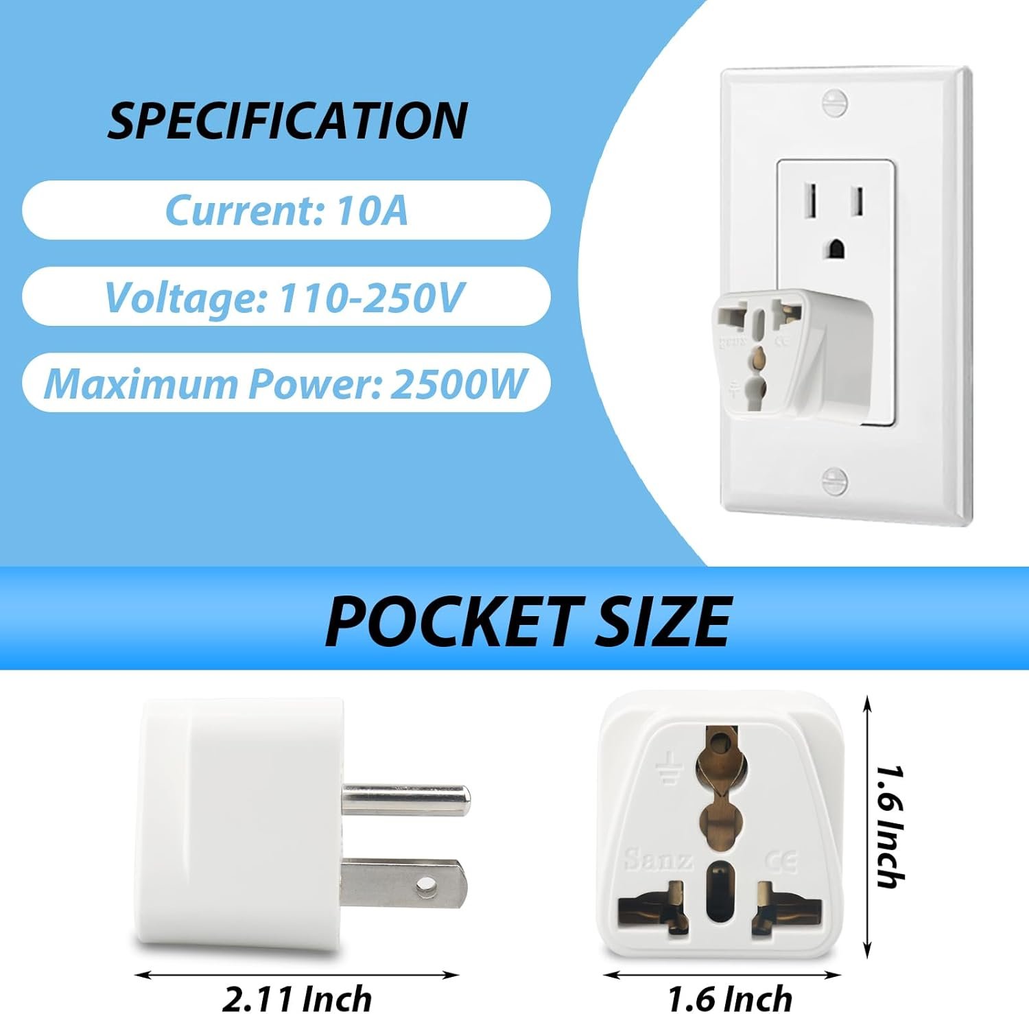 【SAFE & RELIABLE】- These universal plug adapters feature copper pins and conductors, combined with a flame-resistant ABS shell, and are designed to ensure safe electrical use. Voltage current: 110-250V/10A. Maximum power: 2500W.