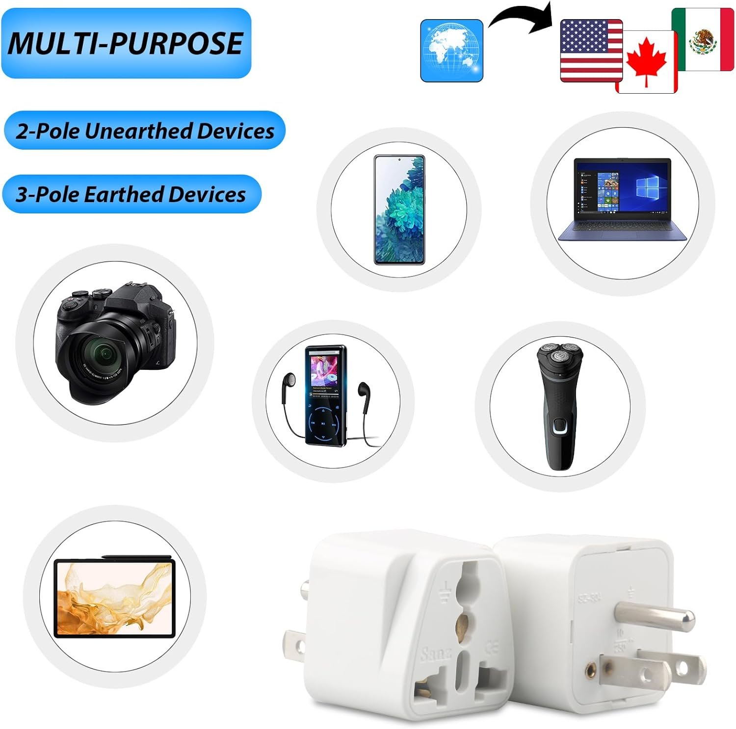 【MULTI-PURPOSE】- These universal travel adapters are perfect for charging smartphones, Bluetooth speakers, cameras, tablets, shavers, headphones, laptops, and more. (Note: This is not a voltage converter; these usa travel adapters are only compatible with 110V–250V wide-voltage devices.)