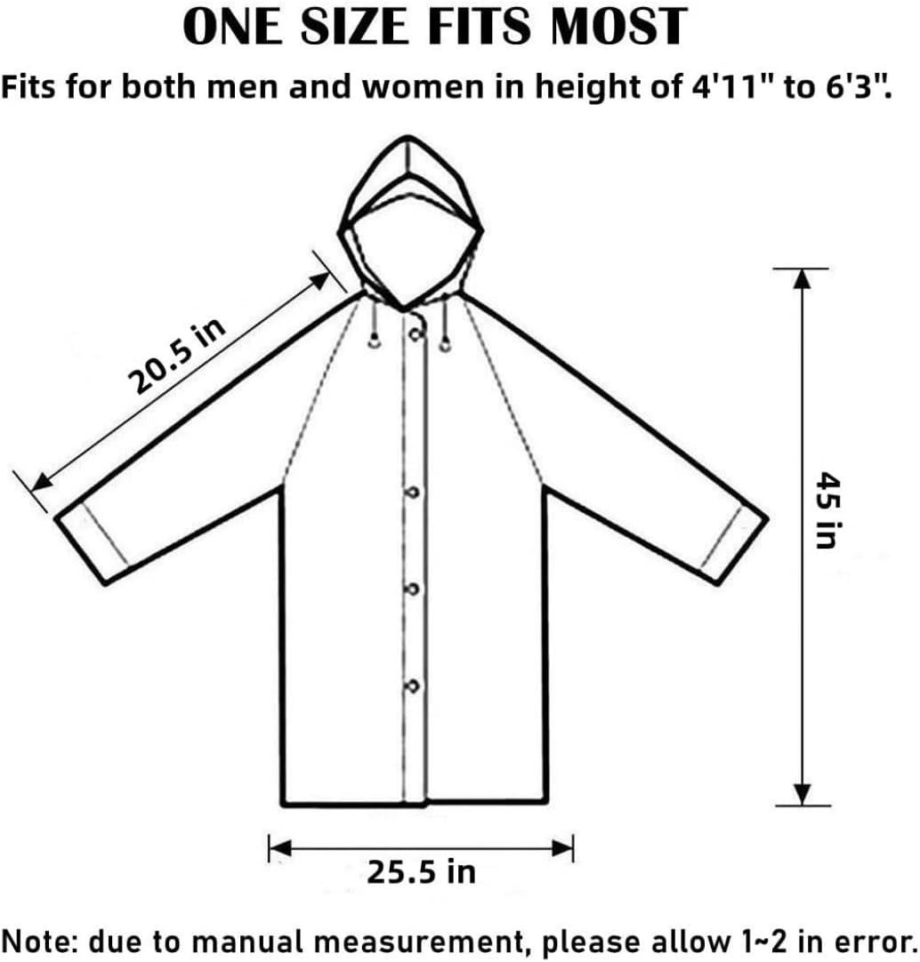 ☔【One Size Fits Most】- Length: 45”, chest: 51”, sleeve length: 20.5”. Designed with loose size and proper length down to the legs, this rain coat is suitable for men, women, teen boys, girls, youth, seniors who is in height of 4’11”~6’3”/150-190cm.