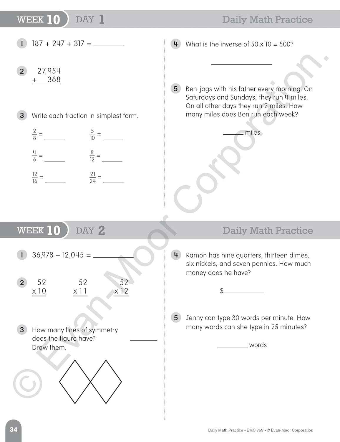 Evan-Moor Daily Math Practice Book for grade 4 provides 10-to-15 minutes of daily math practice. It helps to keep skills sharp with focused practice presented in standardized testing formats. This book has 112 pages and comes with a 36 week progressive program along with scope, sequence charts and answer keys.