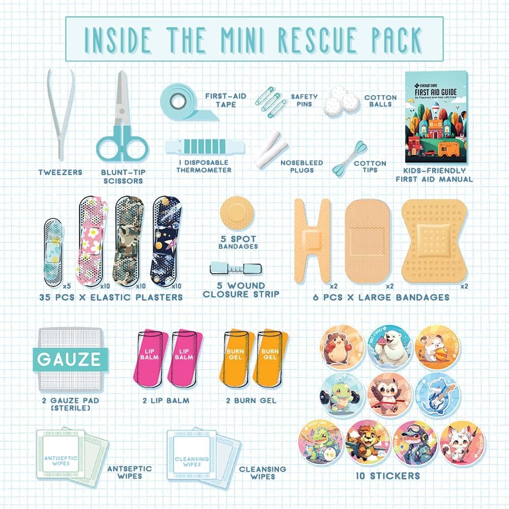 EVERLIT Mini Rescue Pack | 105 Medical Essentials Organized in Portable Storage Bag | Pocket Size Kids First Aid Kit with D Ring | Small Family-Friendly Travel Medical Kit (Rainbow)