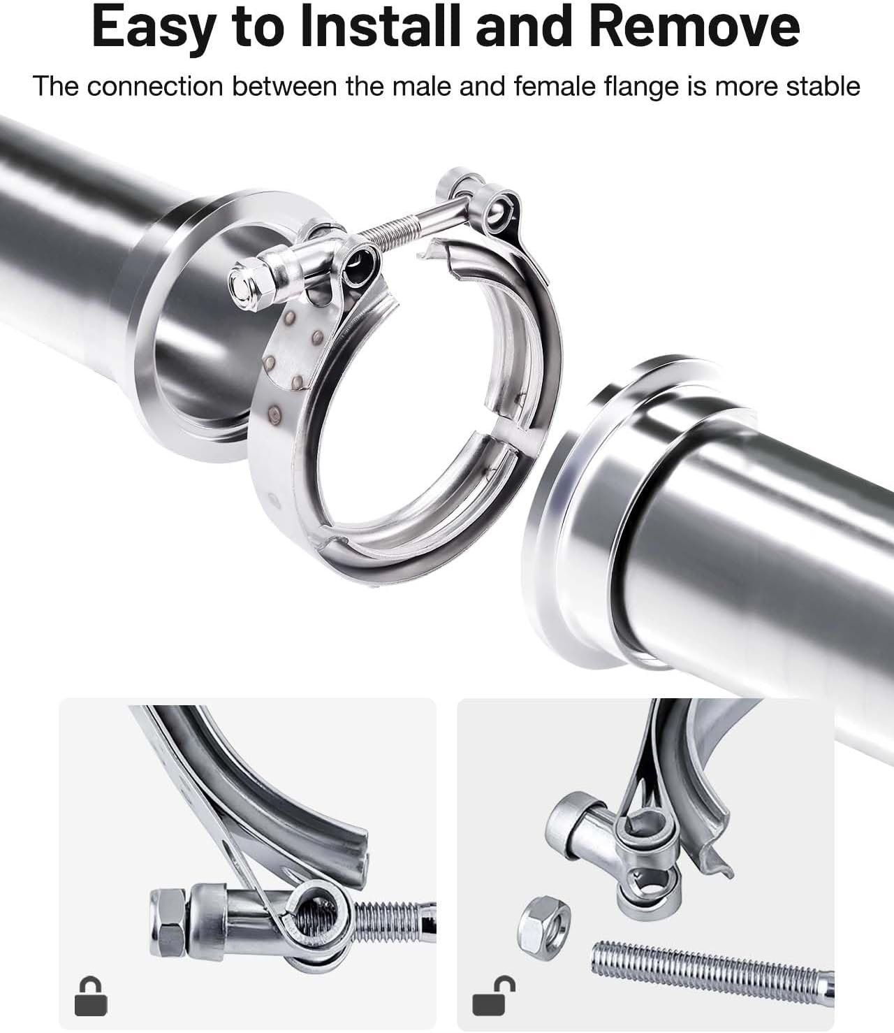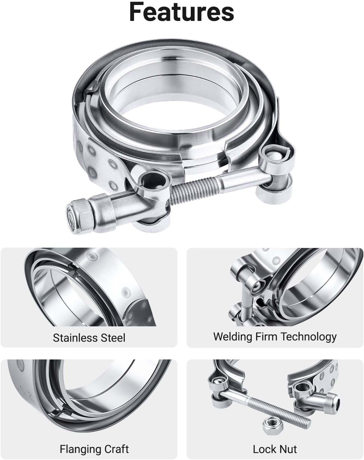 [Material] 304 Stainless steel clamp and flanges; 304 stainless steel for long durability and reliability, corrosion resistance and high-temperature resistance.