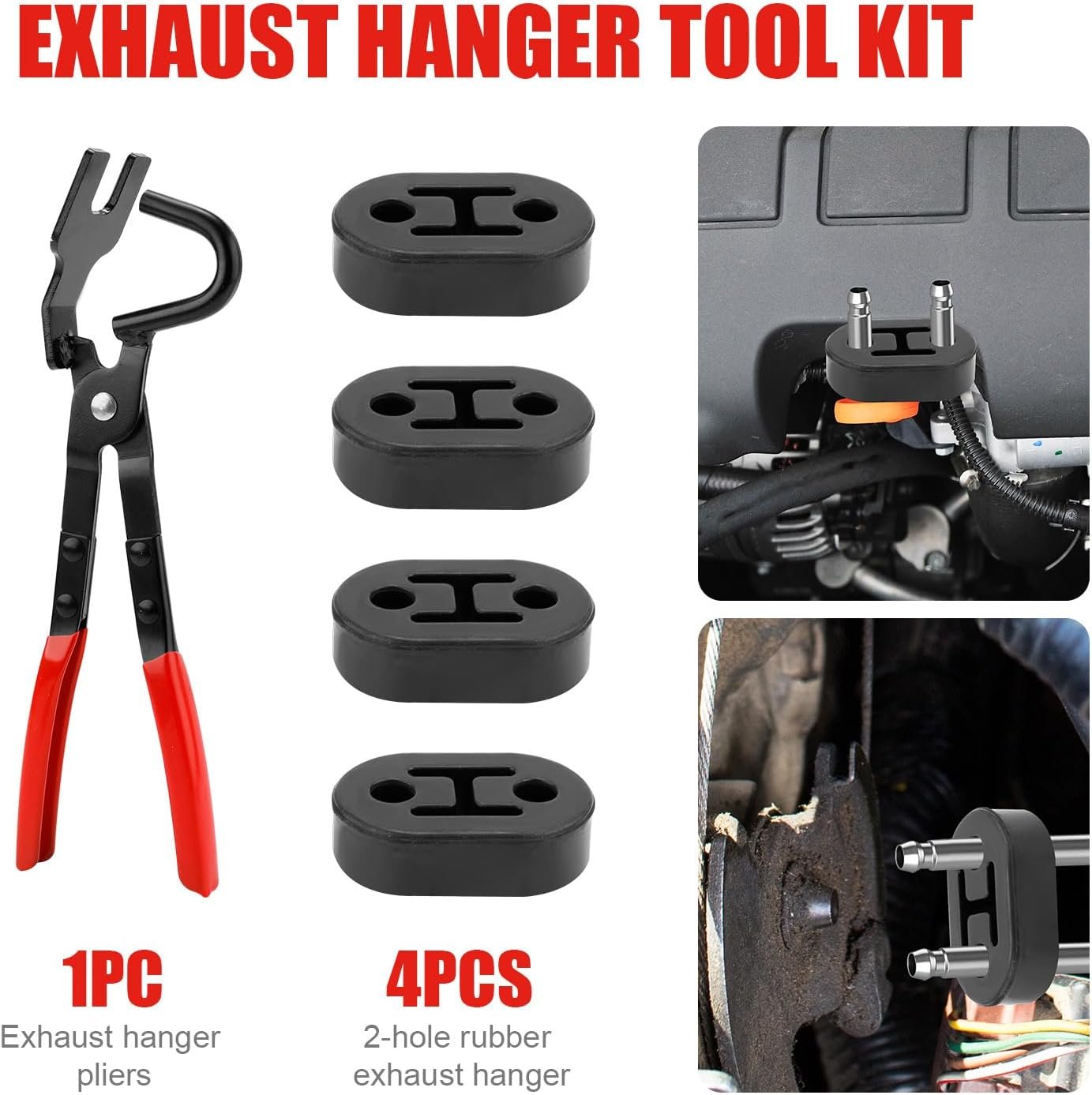 Packing List: You will receive one piece of exhaust hanger pliers and 4 pieces of 2 hole rubber exhaust hangers in the package.