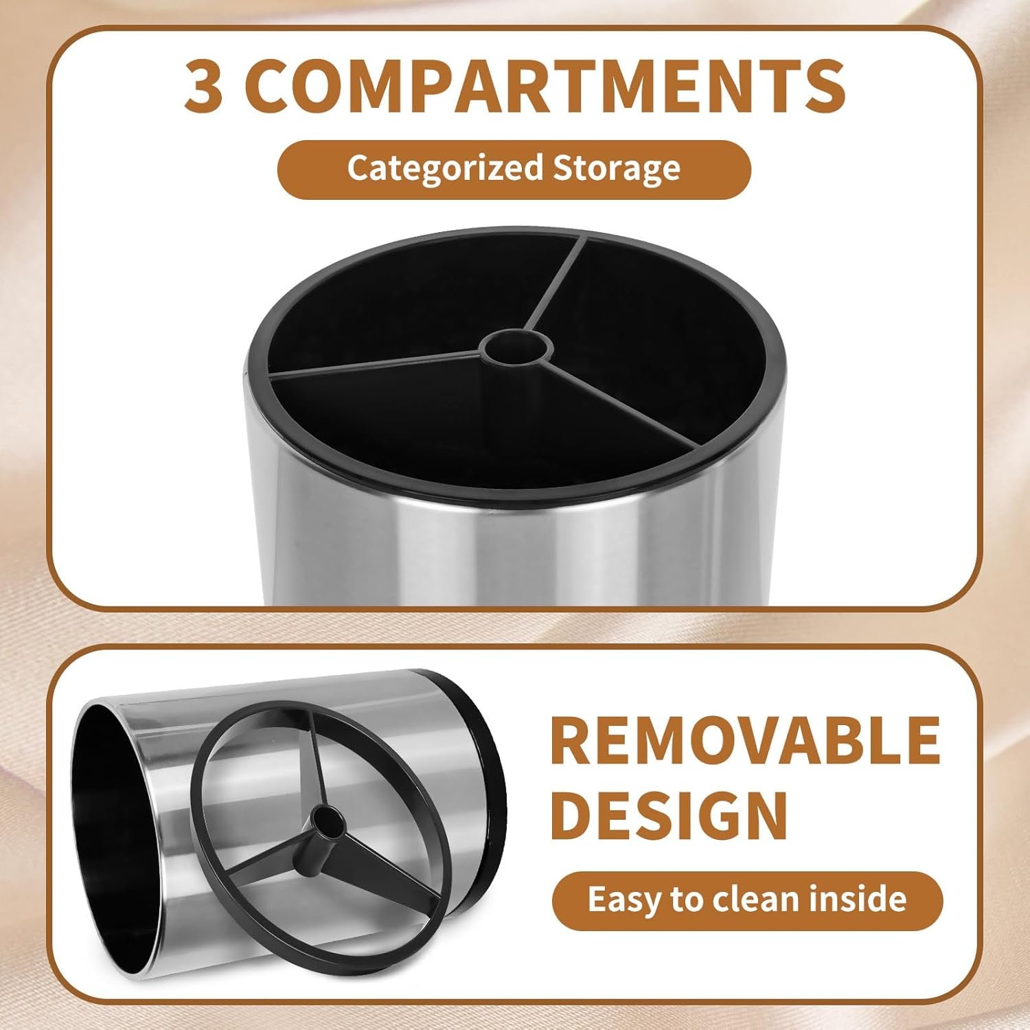 Removable 3 Compartment Lid: This silverware organizer is equipped with a tri-compartment lid on the top, allowing cookware to be categorized and stored. Of course, you can choose to manually remove the top tri-compartment lid which not only allows for larger cookware capacity, but also makes cleaning the inside of the utensil caddy easier