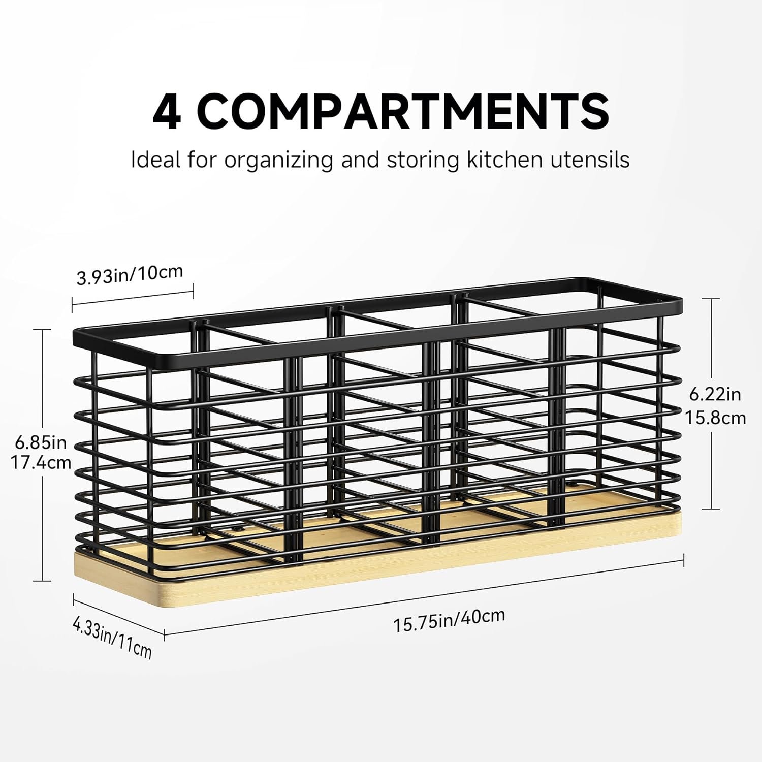 Extra Large Capacity: The dimensions of the utensil holder are 15.75” x 4.33” x 6.85” with 4 compartments. This kitchen utensil holder offers large enough storage space to organize kitchenware such as spatulas, spoons, forks, tongs, whisks, and more. It can hold up to 40 kitchen utensils