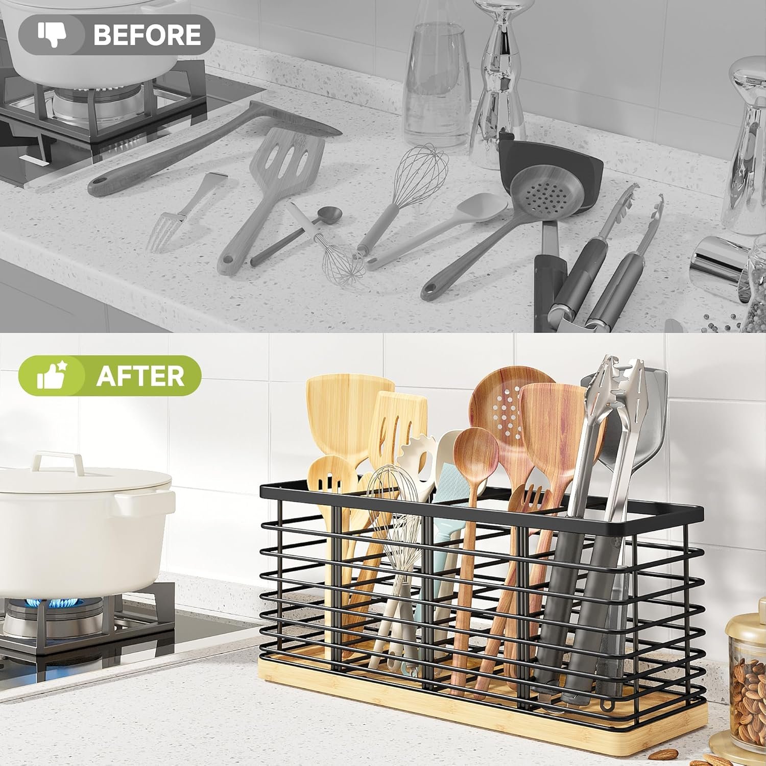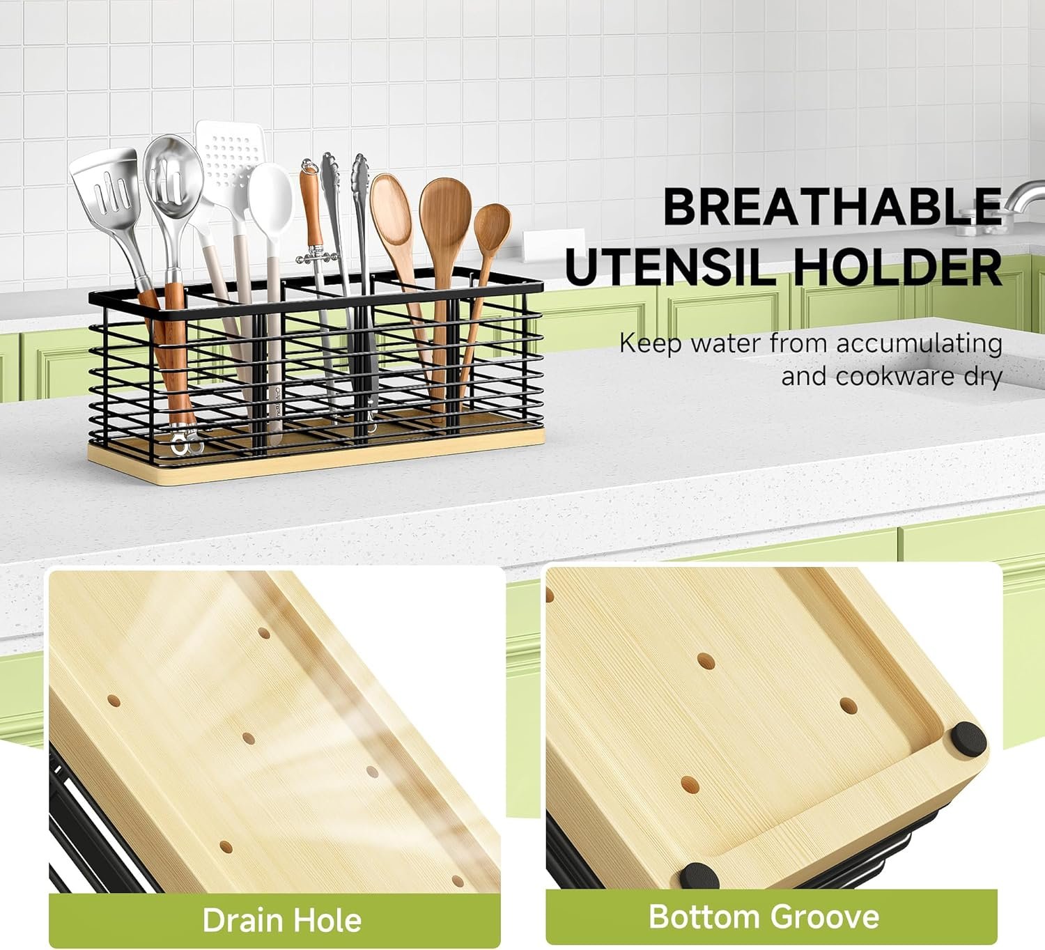 Breathable Utensil Holder: The utensil organizer is made of iron wire with a sparse top and dense bottom to keep utensils from leaking out. The drain holes and grooves at the bottom of the utensil crock keep water from accumulating, making the kitchen utensil organizer breathable